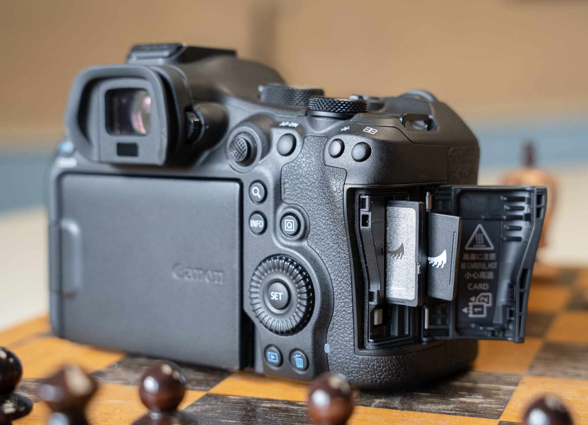 Canon zachował podwójne gniazdo kart pamięci, ale zamiast dwóch kart SD postawiono na parę CFexpress typu B i SD. To z pewnością pozwoli uzyskać lepsze transfery danych.