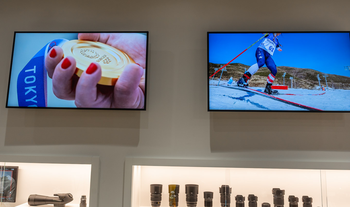 Nad gablotkami z kolei, na dużych ekranach można oglądać zdjęcia wykonane przez wieloletniego ambasadora marki Nikon, Adama Nurkiewicza.