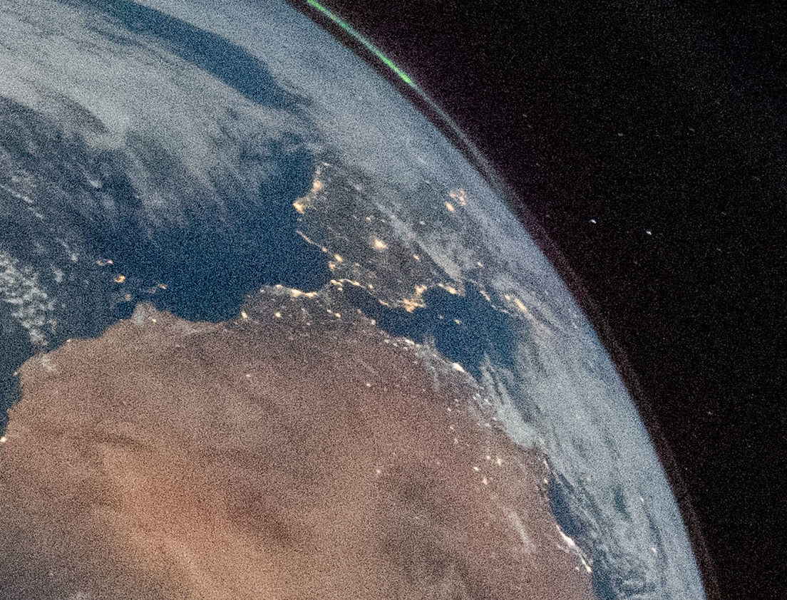 Fragment północnej Afryki i półwyspu Iberyjskiego z widocznymi światłami miast oraz zorzą polarną. Wycinek zdjęcia "Hello, World". Źródło: Wikipedia. Gregory Reid Wiseman/NASA