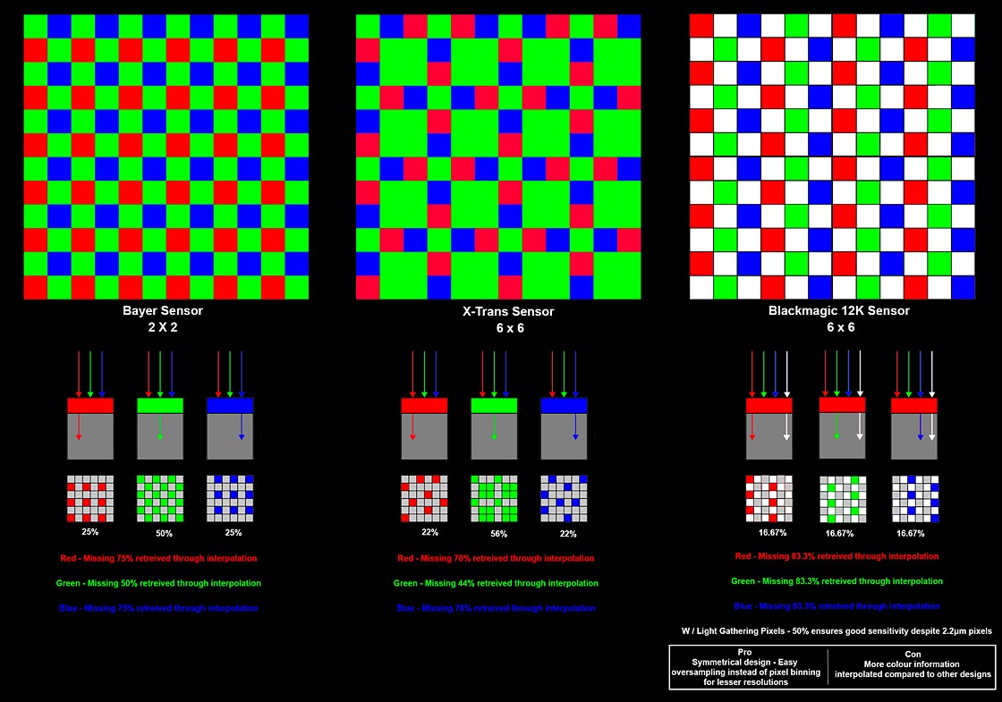 Ma w tym zapewne swoją zasługę nietypowa architektura sensora 12K, gdzie pikseli czerwonych, zielonych i niebieskich jest tyle samo, a całość uzupełnia spora ilość pikseli białych, które stanowią 50% całości. To one zapewne pomagają kamerze uzyskać omówiony w poprzednim rozdziale zakres tonalny.