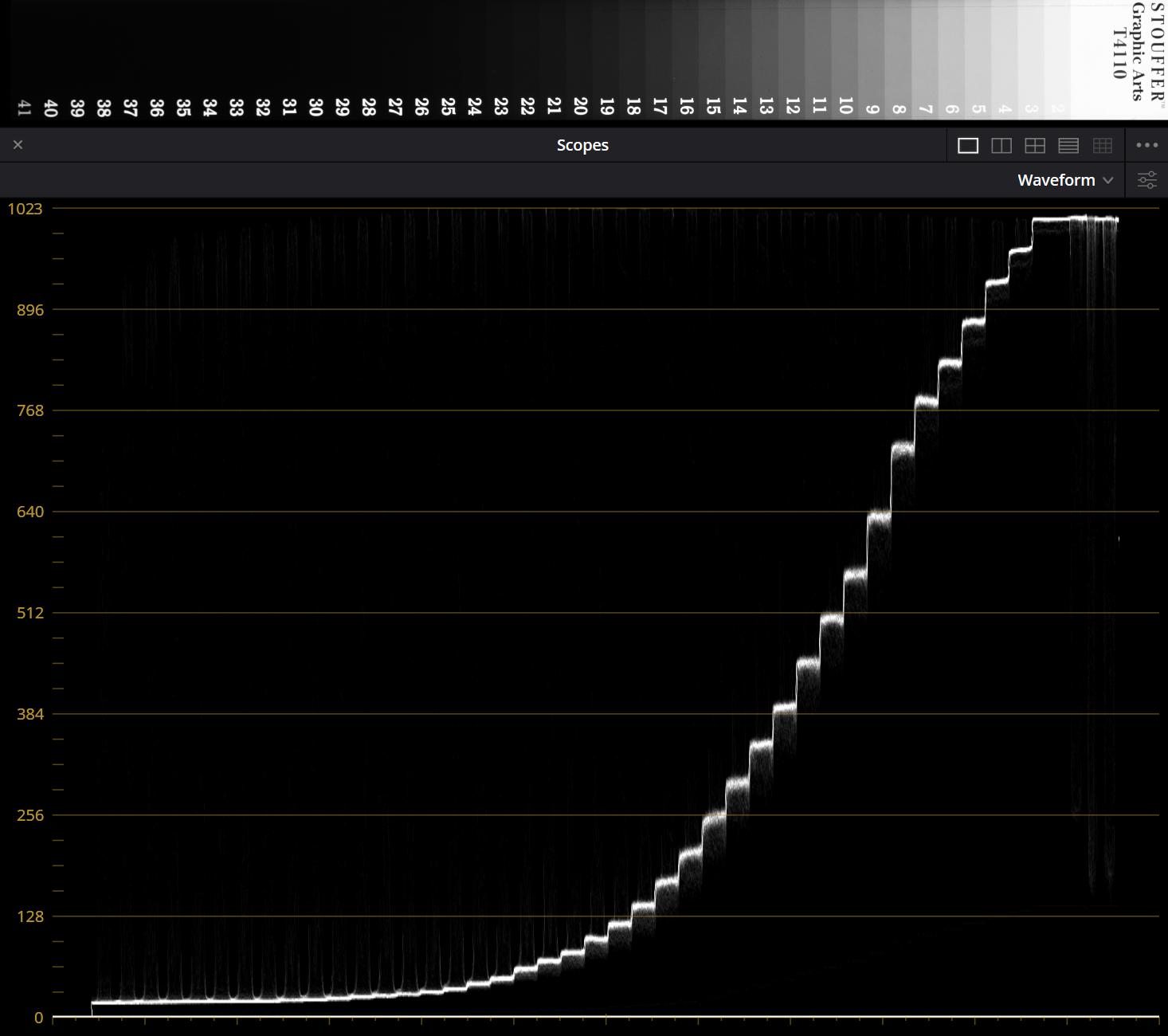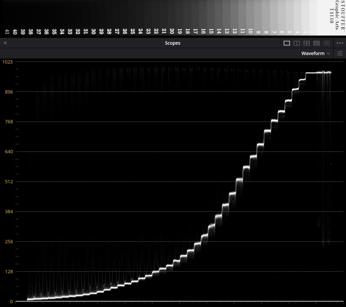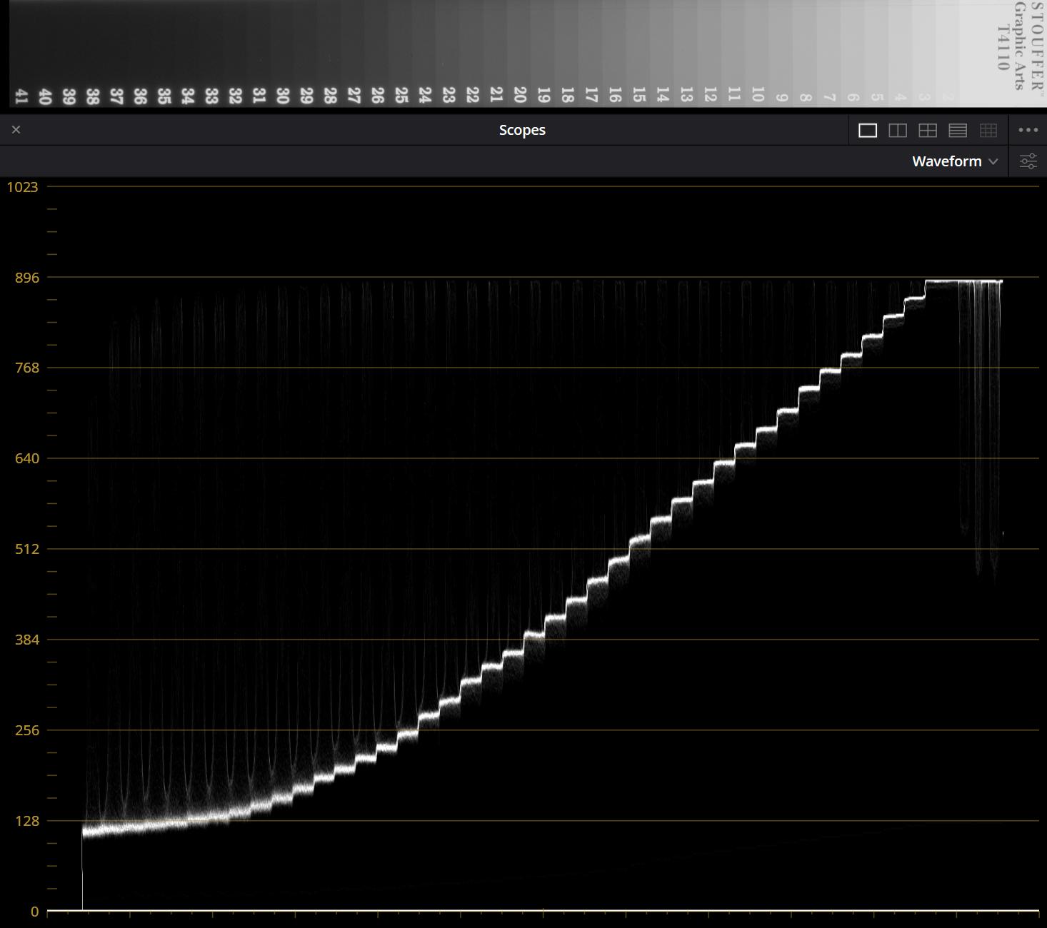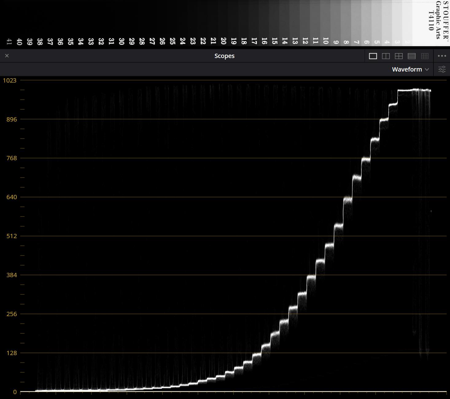 Oprócz tego, w prezentującej te wyniki poniższej tabeli, załączamy także wykresy waveform monitor z programu DaVinci Resolve, prezentujące, jakie wartości przyjmują poszczególne pola tablicy zależnie od użytego profilu obrazu. Tablica była nagrywana tak, by prześwietlić pierwsze jedno lub dwa pola.