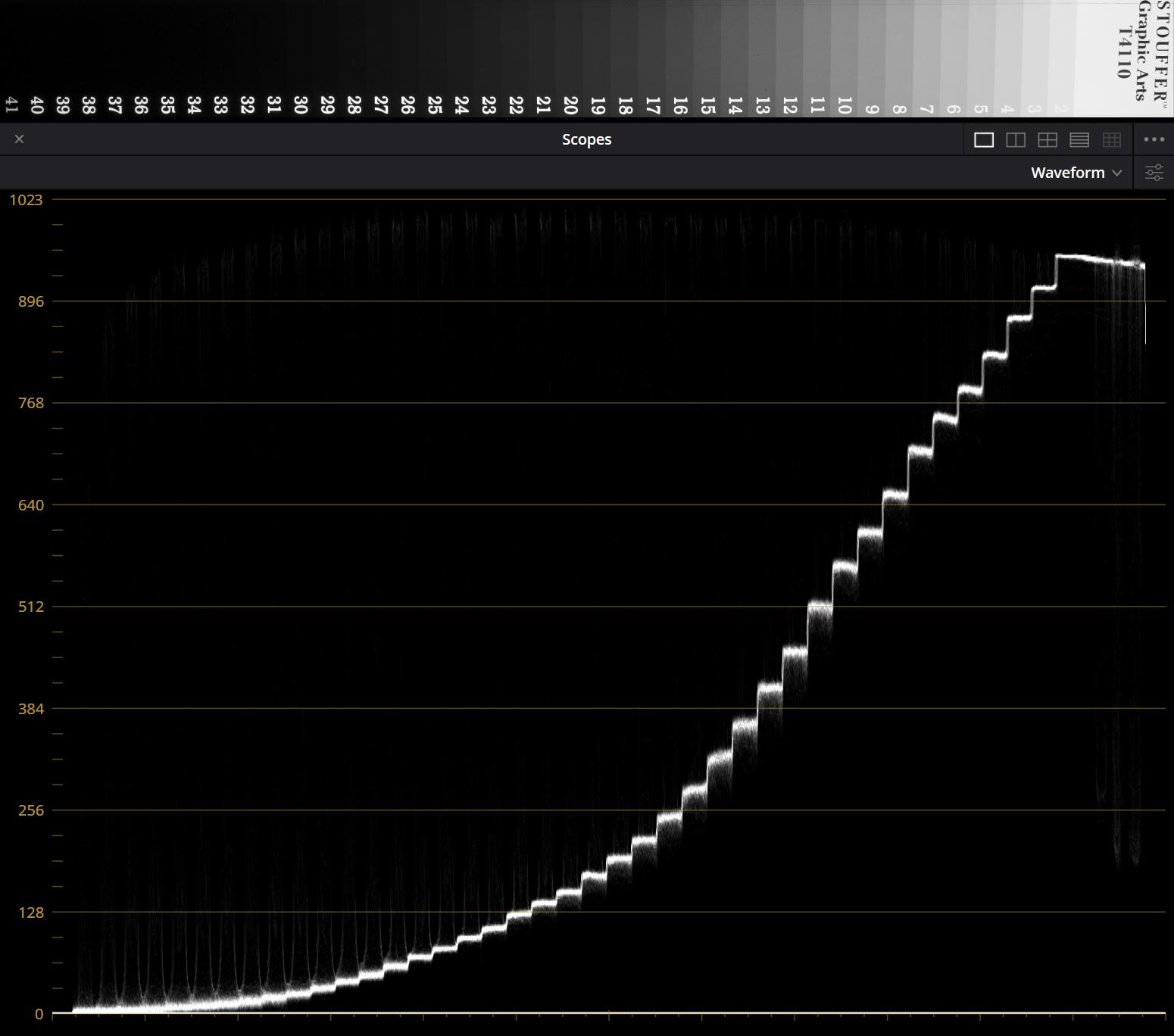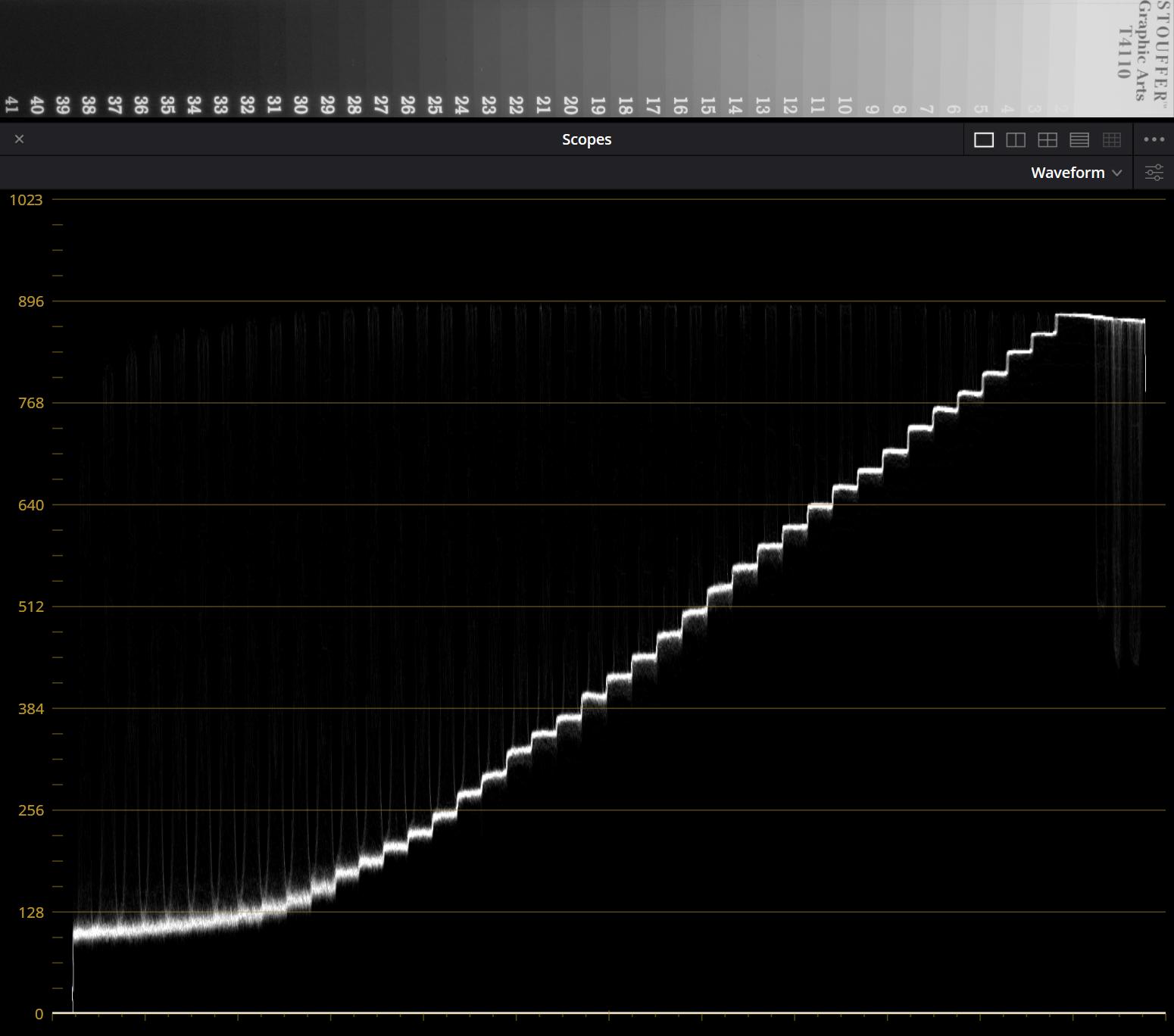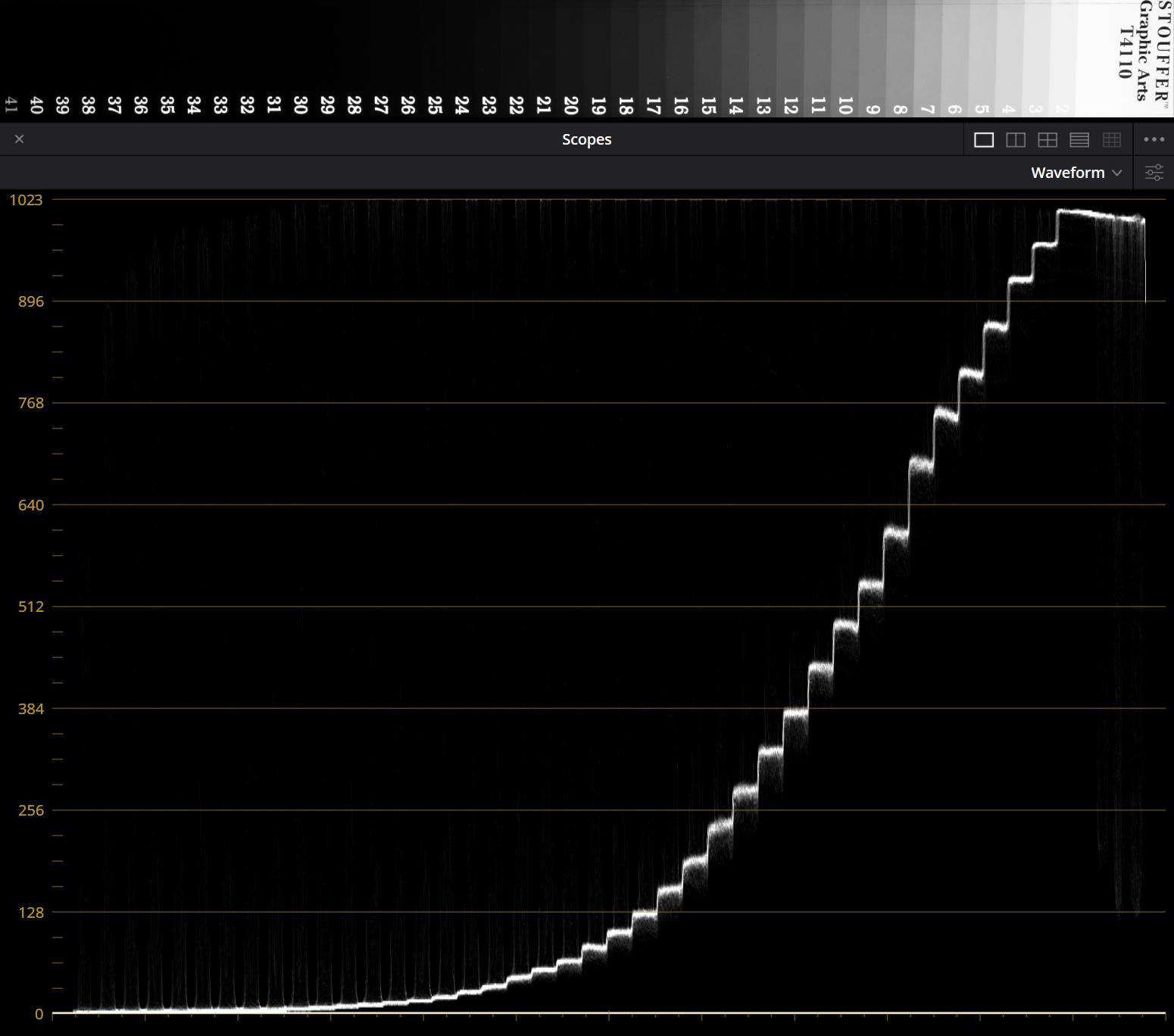 Oprócz tego, w prezentującej te wyniki poniższej tabeli, załączamy także wykresy waveform monitor z programu DaVinci Resolve, prezentujące, jakie wartości przyjmują poszczególne pola tablicy zależnie od użytego profilu obrazu. Tablica była nagrywana tak, by prześwietlić pierwsze jedno lub dwa pola.