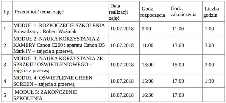 • Uczestnicy poznają sposoby kluczowania i osadzania postaci w wirtualnej przestrzeni. Uczestnicy po odbytym szkoleniu zdobędą uporządkowaną wiedzę na temat tego jak w sposób profesjonalny przygotować się do realizacji reklamy, klipu, dokumentu filmowego, dobór kamery, optyki, ustawienia sprzętu.