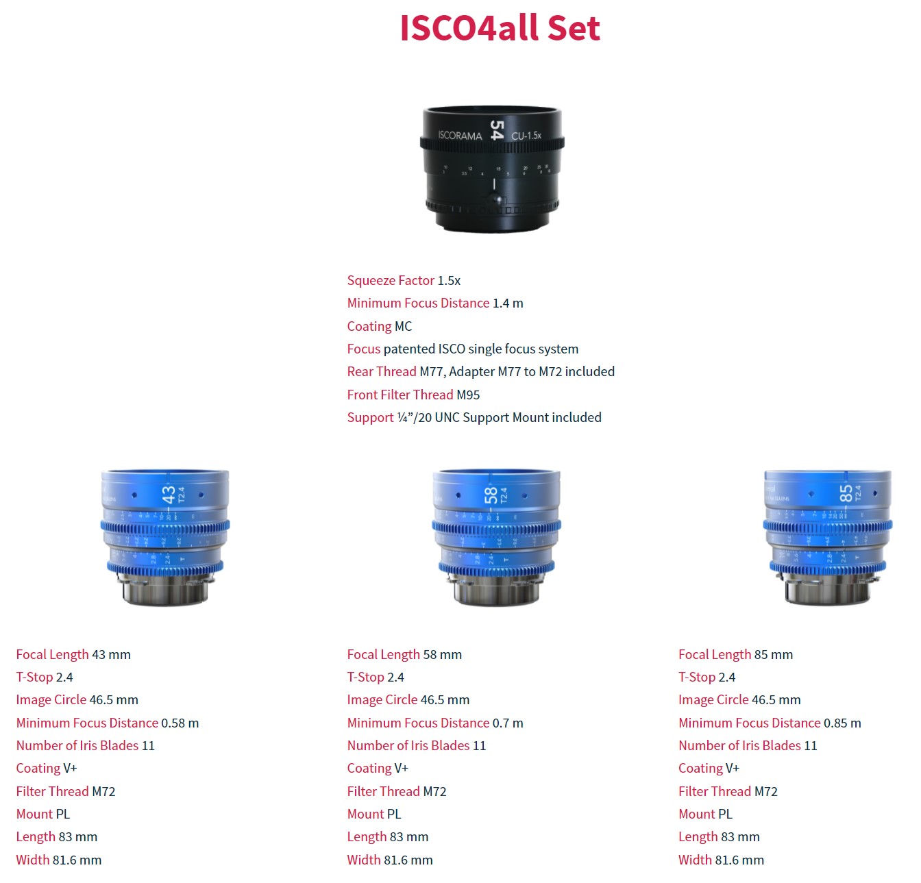 W skład zestawu wchodzi mocowana na froncie obiektywu nasadka anamorficzna o współczynniku kompresji obrazu wynoszącym 1.5x oraz trzy klasyczne, "sferyczne" obiektywy o parametrach: