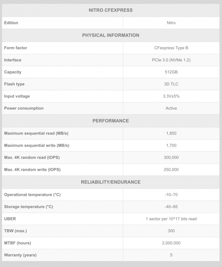 Według deklaracji opublikowanej na stronie producenta, jest to pierwsza karta tego typu na świecie, która posiada certyfikację Video Performance Guarantee Profile 4 (VPG400). Oznacza ona gwarantowany ciągły zapis danych z prędkością co najmniej 400 MB/s. Z kolei maksymalna deklarowana prędkość zapisu to 1700 MB/s, a odczytu - 1850 MB/s.