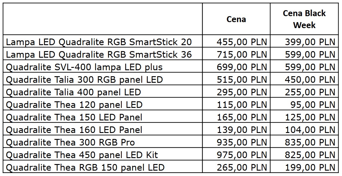 W ramach promocji z okazji "Black Week" wybrane lampy LED marki Quadralite z liniii Smart Stick, Talia, Thea oraz Quadralite SVL będą dostępne w nowych, niższych cenach.