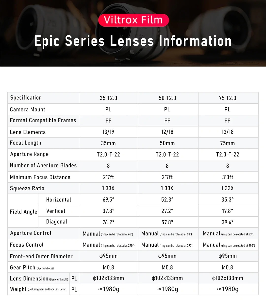Wszystkie trzy obiektywy mają identyczne wymiary zewnętrzne i rozmieszczenie pierścieni ostrości i przysłony, a także, co nadal dość niespotykane, identyczną wagę. Nie są to przy tym konstrukcje filigranowe — każdy z obiektywów waży niemal 2 kilogramy. Ich dokładne specyfikacje prezentuje poniższa tabela: