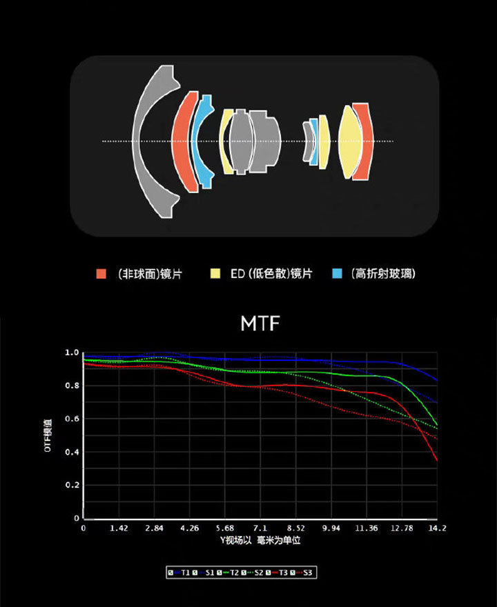 - Konstrukcja: 11 elementów / 10 grup (2 elementy asferyczne, 3 elementy ze szkła ED, 2 elementy ze szkła HR),