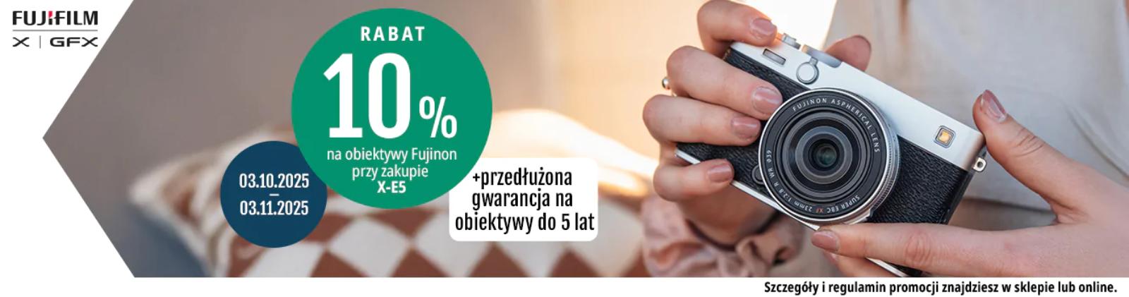 Od 03.10.2025 do 03.11.2025 przy zakupie aparatu Fujifilm X-E5 w dowolnej konfiguracji otrzymasz rabat 10% przy zakupie dowolnego obiektywu z serii XF!