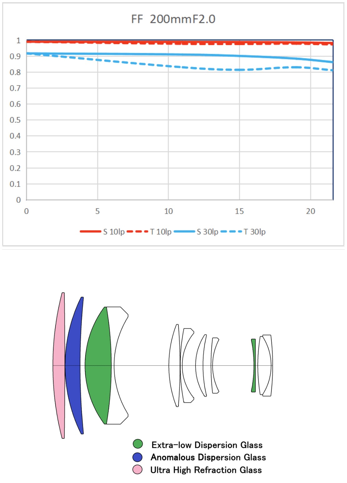 - Konstrukcja: 11 elementów / 9 grup (2 elementy ze szkła ED, 1 element ze szkła HR, 1 element ze szkła o anomalnej dyspersji),
