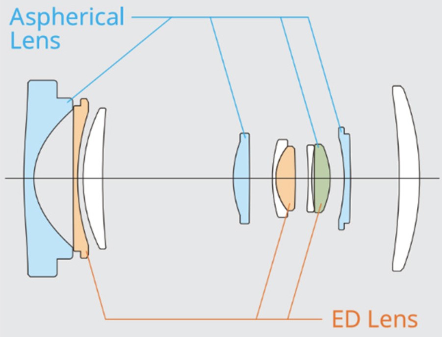 - Konstrukcja: 10 elementów / 9 grup (4 elementy asferyczne, 3 elementy ze szkła ED),