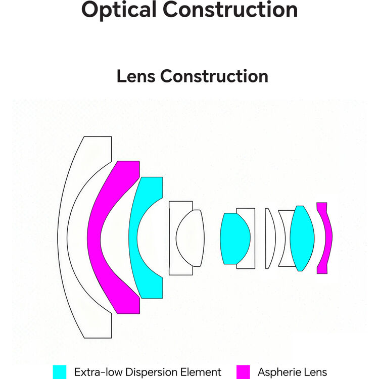 - Konstrukcja: 11 elementów / 8 grup (3 elementy ze szkła ED, 2 elementy asferyczne),