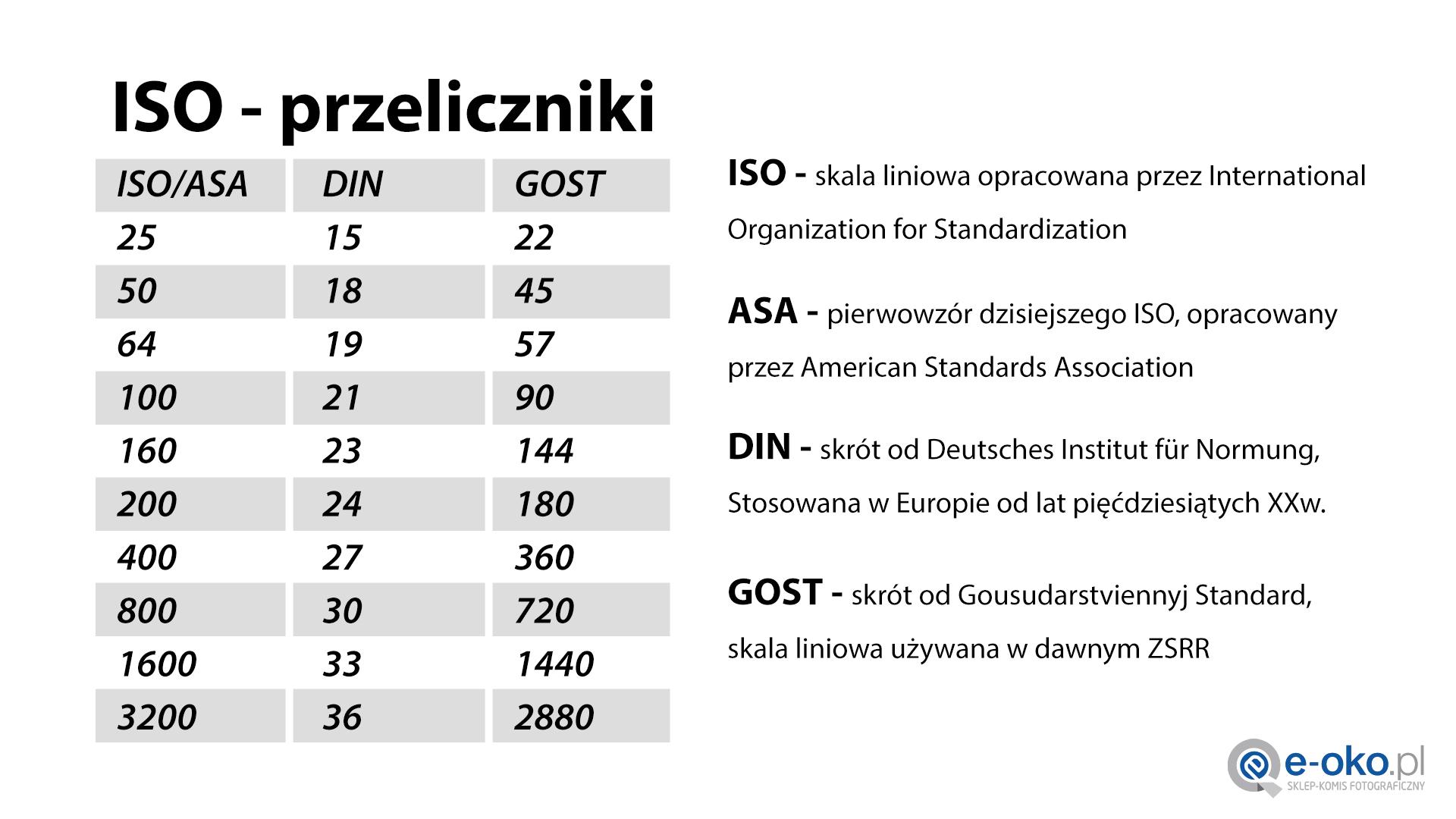 W materiale przedstawiono również różnice pomiędzy dawnymi systemami oznaczeń – ASA, DIN i GOST, a także sposób ich przeliczania na współczesne wartości ISO. To interesujące spojrzenie na ewolucję standardów fotograficznych, które pozwala lepiej zrozumieć, jak zmieniała się technologia i sposób zapisu parametrów ekspozycji.