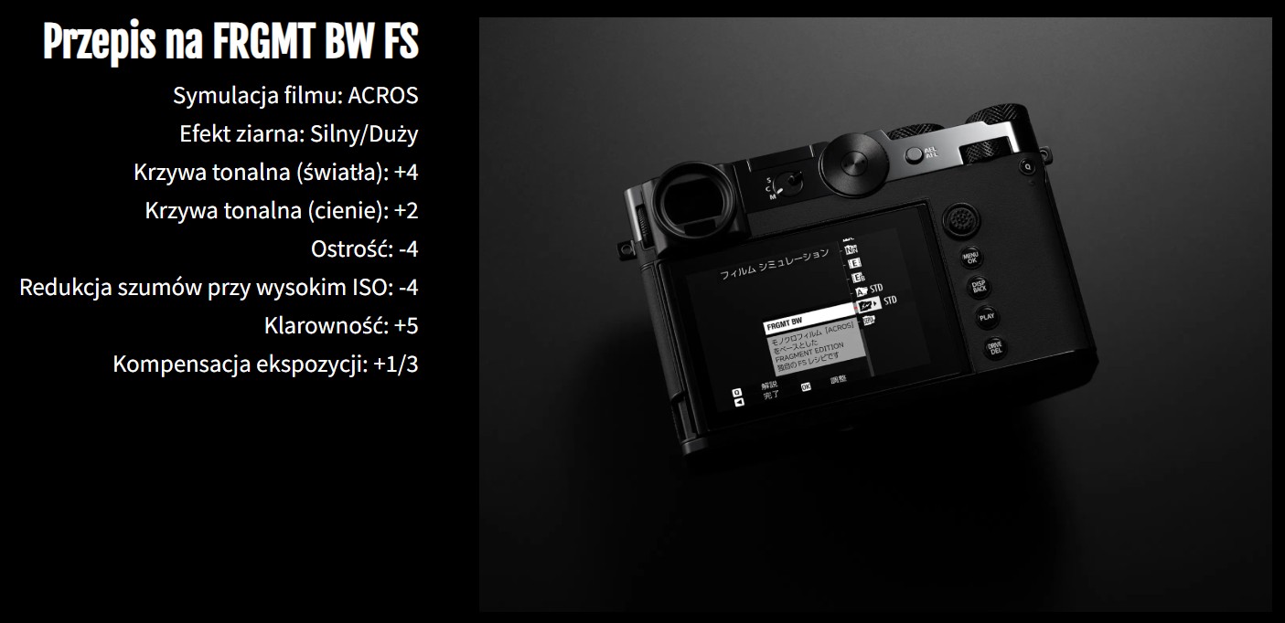 Parametry techniczne limitowanej edycji nie różnią się oczywiście od standardowego modelu GFX 100 RF. Choć akurat w tym przypadku wewnątrz zaszła jedna zmiana – limitowane aparaty mają fabrycznie wgrany „przepis” na monochromatyczny profil obrazu FRGMT BW FS. Można go też oczywiście odtworzyć na dowolnym innym korpusie Fujifilm stosując recepturę podaną poniżej.