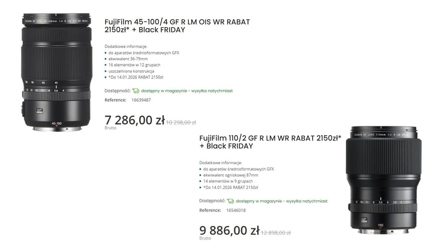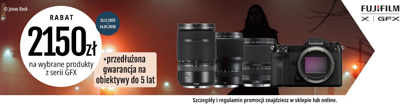 Od 13.11.2025 do 14.01.2026 wybrane aparaty i obiektywy Fujifilm GFX kupisz z natychmiastowym rabatem 2150 zł!