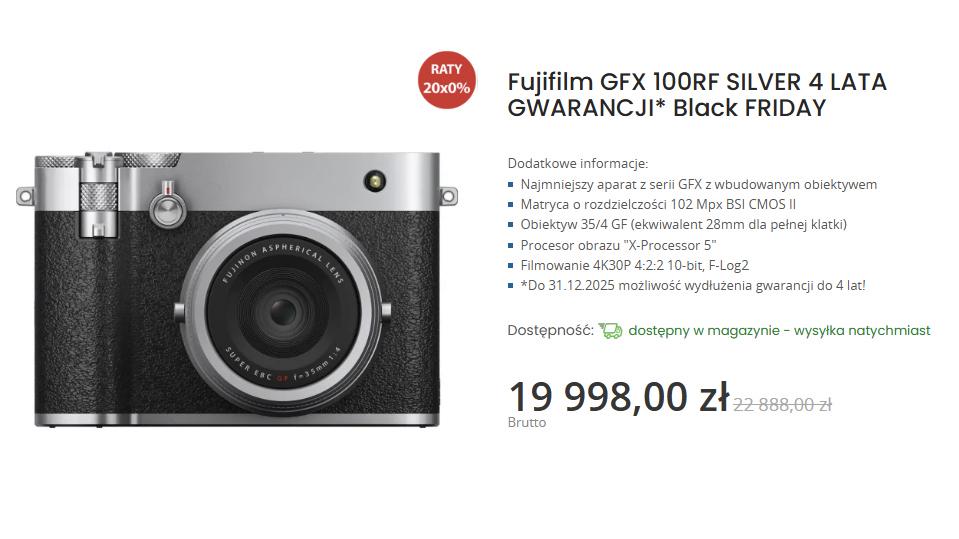 Szczególną uwagę przyciąga maksymalna obniżka na aparat Fujifilm GFX 100RF, który dzięki swojej rozdzielczości i precyzyjnemu odwzorowaniu barw stanowi narzędzie wybierane zarówno przez wymagających twórców, jak i fotografów pracujących komercyjnie.