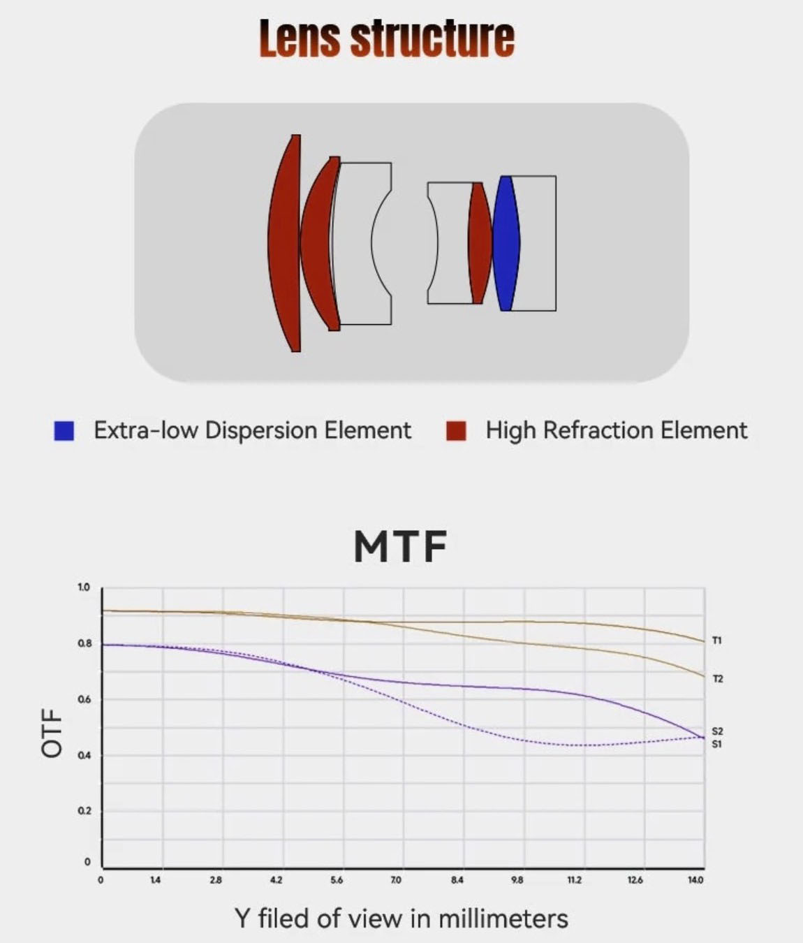 - Konstrukcja: 7 elementów / 5 grup (1 element ze szkła ED, 3 elementy ze szkła HR),