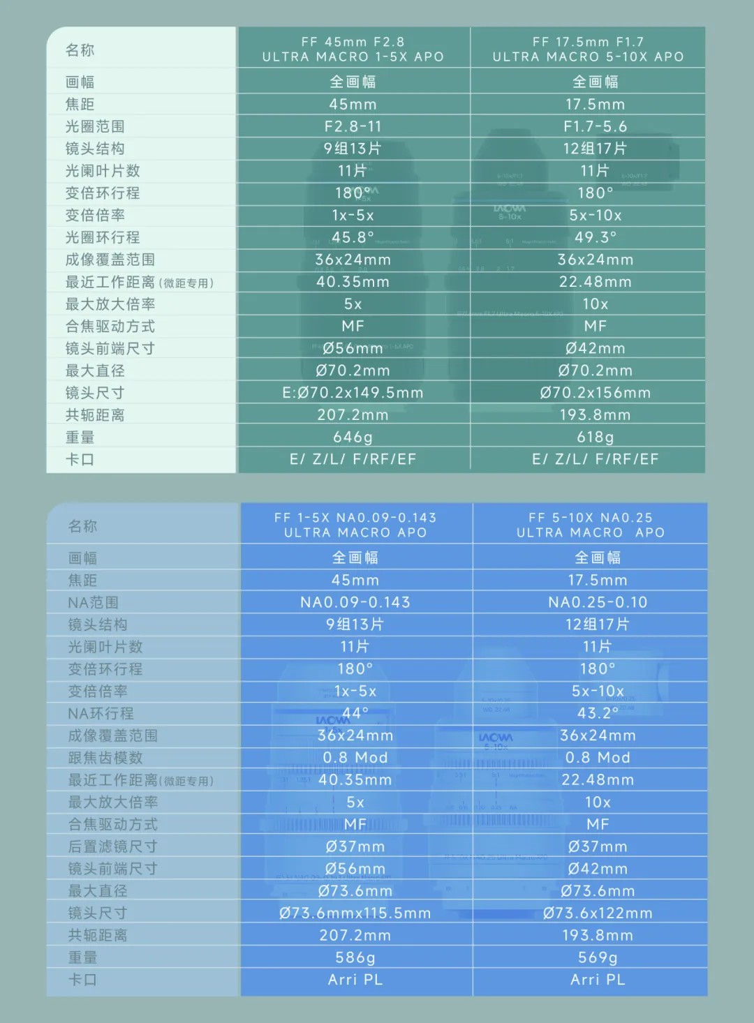 Venus Optics ma w przyszłym roku wypuścić dwa pełnoklatkowe instrumenty typu ultra makro o konstrukcji parafokalnej. Pierwszy, 45 mm f/2.8, ma oferować skalę odwzorowania od 1:1 do 5:1. Drugi natomiast, 17.5 mm f/1.7, od 5:1 do 10:1. Oba będą dostępne z mocowaniami Canon EF i RF, L-mount, Nikon F i Z i Sony FE, jak również Arri PL.