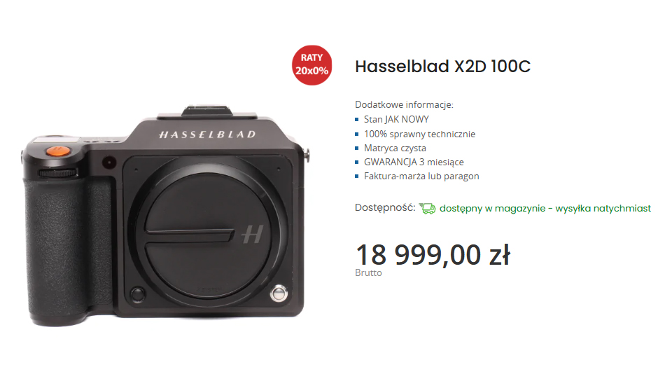 - Hasselblad X2D 100C + 80/1.9 XCD – 29 999 zł