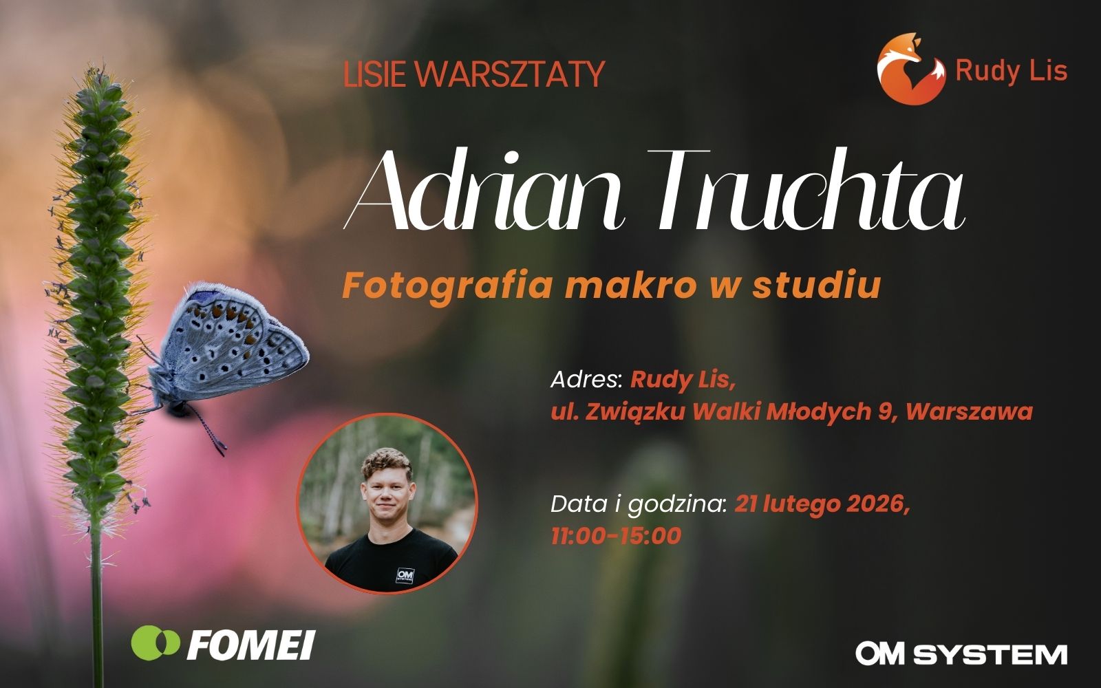 21 lutego 2026 roku odbędą się stacjonarne warsztaty makrofotografii przyrodniczej prowadzone przez Adriana Truchtę - fotografa specjalizującego się w fotografii owadów i pajęczaków oraz ambasadora marki OM SYSTEM. Wydarzenie organizowane jest przez sklep Rudy Lis i ma formę czterogodzinnych warsztatów studyjnych z naciskiem na praktykę.