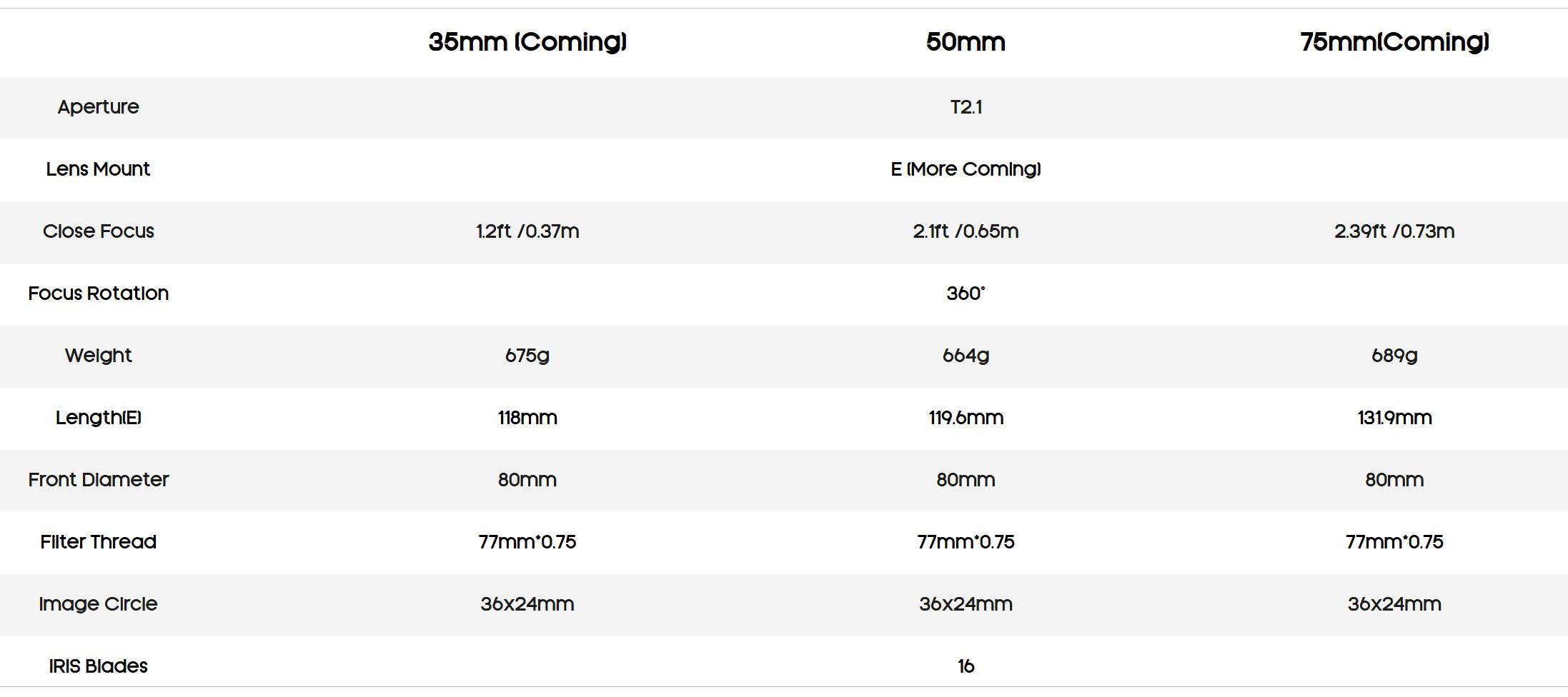 Co ciekawe, różne w obrębie serii jest rozmieszczenie pierścieni ostrości i przysłony. Jest to dość nietypowe jak na obiektywy filmowe, ale może sugerować, że wobec możliwości sterowania ostrością i przysłoną z poziomu korpusu, robienie tego za pośrednictwem zewnętrznych akcesoriów nie zostało przez producenta przewidziane.