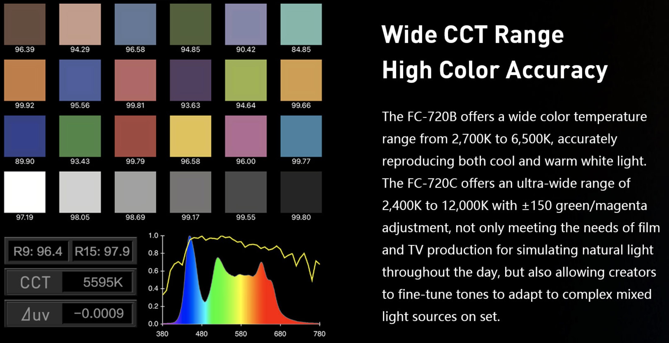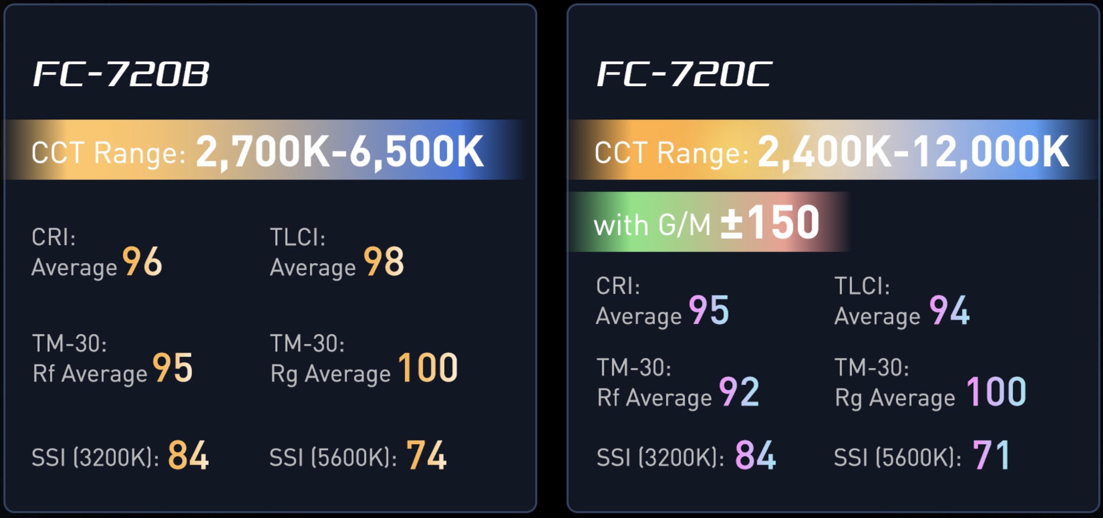 W przypadku modelu FC-720C natężenie oświetlenia sięga 11400 luksów dla światła 5600K (w identycznych warunkach pomiaru jak powyżej) oraz 3700 luksów dla czystego światła zielonego. Kolorowy wariant oferuje przy tym tryby pracy RGB i HSI oraz tryb symulacji folii efektowych i 15 różnego rodzaju efektów symulujących ogniska, radiowozy, telewizory, fajerwerki i inne zmienne źródła światła.