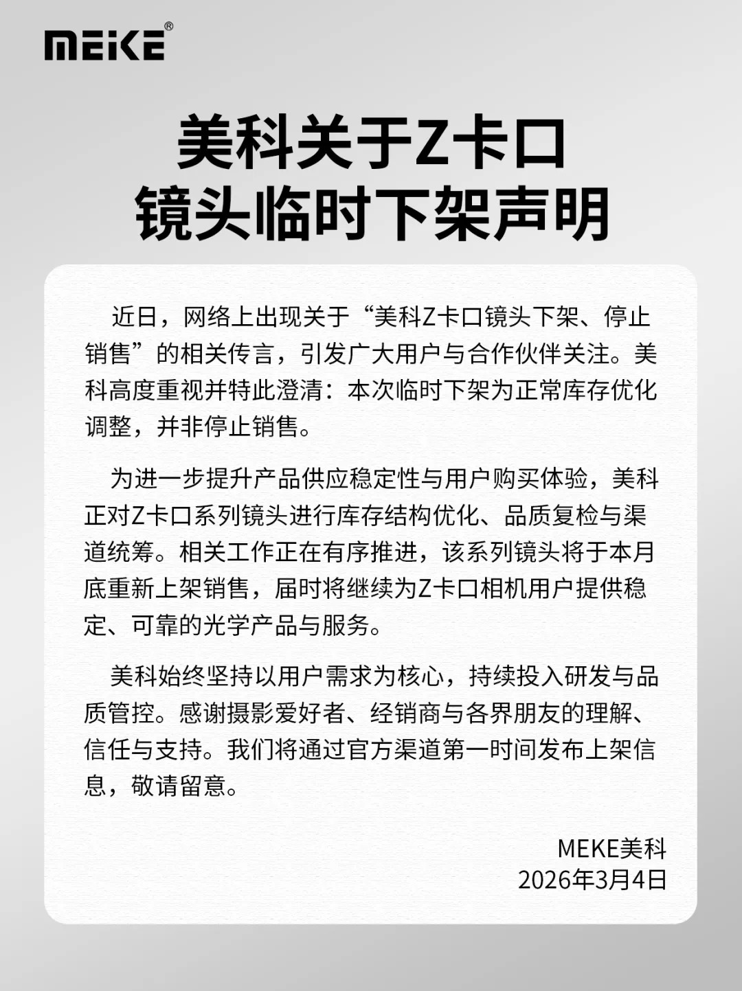 "Meike udostępniło komunikat informujący, że wycofanie obiektywów jest jedynie tymczasowe i wynika z konieczności „optymalizacji i inwentaryzacji zapasów magazynowych”."
