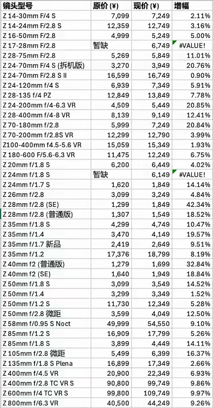 Zmiany cen obiektywów Nikkor z mocowaniem Z na chińskim rynku |
