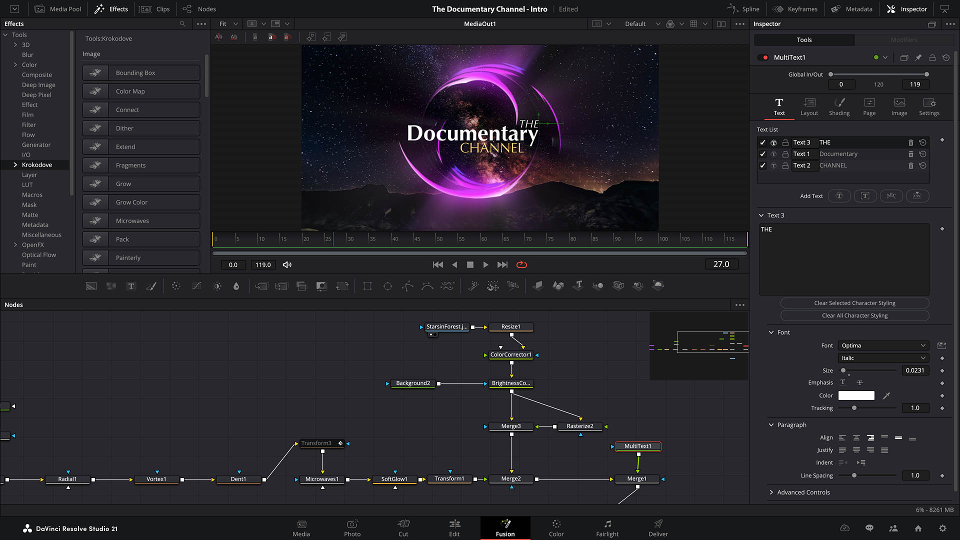Fusion posiada teraz Krokodove, popularną i stale rosnącą bibliotekę narzędzi do kompozytowania. Obejmuje zarówno narzędzia użytkowe zwiększające produktywność, jak i niezbędne narzędzia wektorowe i danych, a także konfigurowalne szablony grafik 2D i 3D, które można używać w całym DaVinci Resolve.