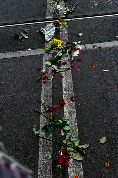 Ja widzę na tym zdjęciu jak historia bezwzględnie ocenia ostatnią żałobę narodową wytykając jej przerost formy nad treścią. Zdeptane przez tłum kwiaty, foliówka, jakiś "frendzel" w rogu. A wszystko na tle brukowego krzyża. Myślę, że większość uczestników tych wydarzeń była tam po to żeby "dotknąć historii", podnieść w swoich oczach własną wartość i mieć o czym opowiadać dzieciom, wnukom, sąsiadom. W każdym bądź razie, szczególnie na takiej wystawie najważniejsza jest sfera Punctum i to jakie emocje budzi w nas fotografia. I nie ma tam miejsca na spory o interpretację - jeden widzi groteskę, inny Pospieszalskiego a ktoś jeszcze wzruszy się i uroni parę łez.