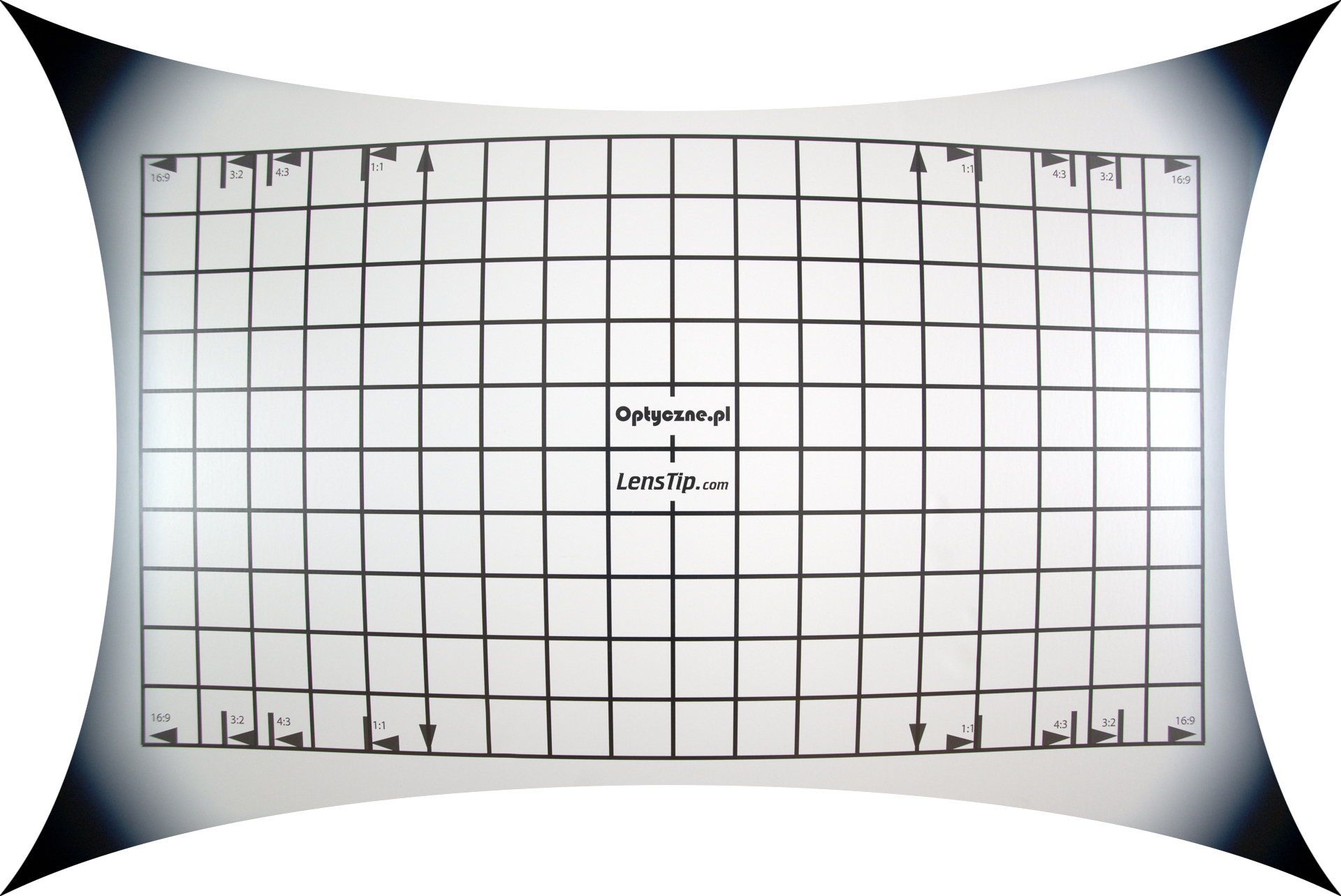 Zgoła odmiennie sytuacja wygląda dla plików RAW. To co widać dla ogniskowej 16 mm (w ekwiwalencie) przypomina bez mała obiektyw rybie oko, a ogromny wynik -15.8% mówi sam za siebie. Również dla środkowej ogniskowej poziom dystorsji jest bardzo wysoki. Dopiero dla maksymalnej wada ta zanika, co widać zarówno w JPEG-ach, jak i nieskorygowanych RAW-ach. Formalnie mamy do czynienia ze zniekształceniem poduszkowym, ale jego poziom jest praktycznie bliski zera.