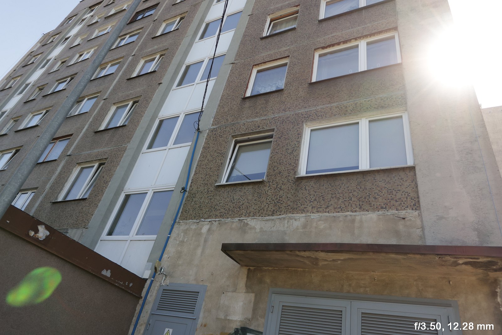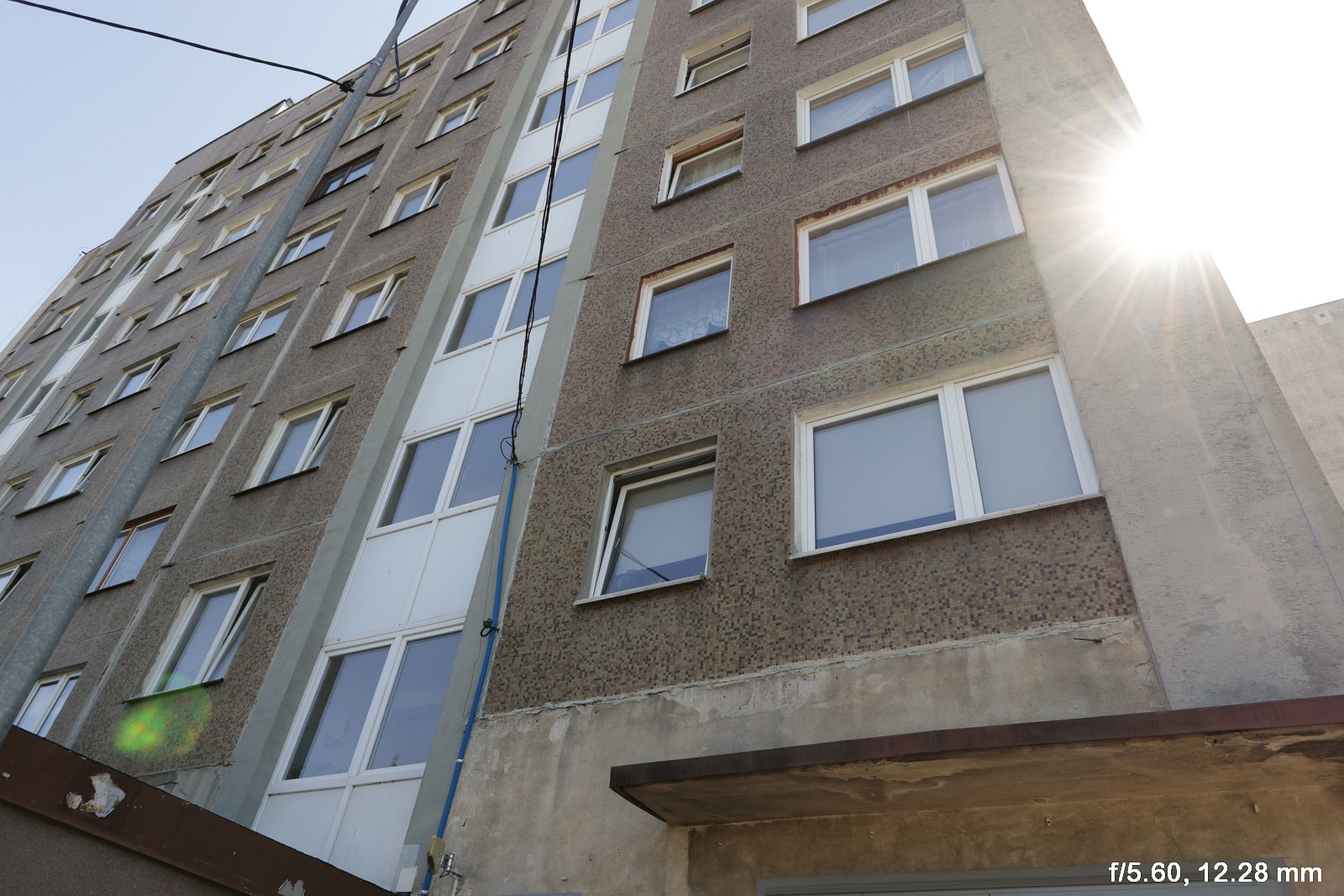 Dla formatu JPEG i najszerszego kąta widzenia, dystorsja jest zauważalna, choć nie jest to poziom, który będzie bardzo przeszkadzał. Zniekształcenie beczkowe trochę zmniejsza się po przejściu z odpowiednika ogniskowej 16 mm do 24 mm.