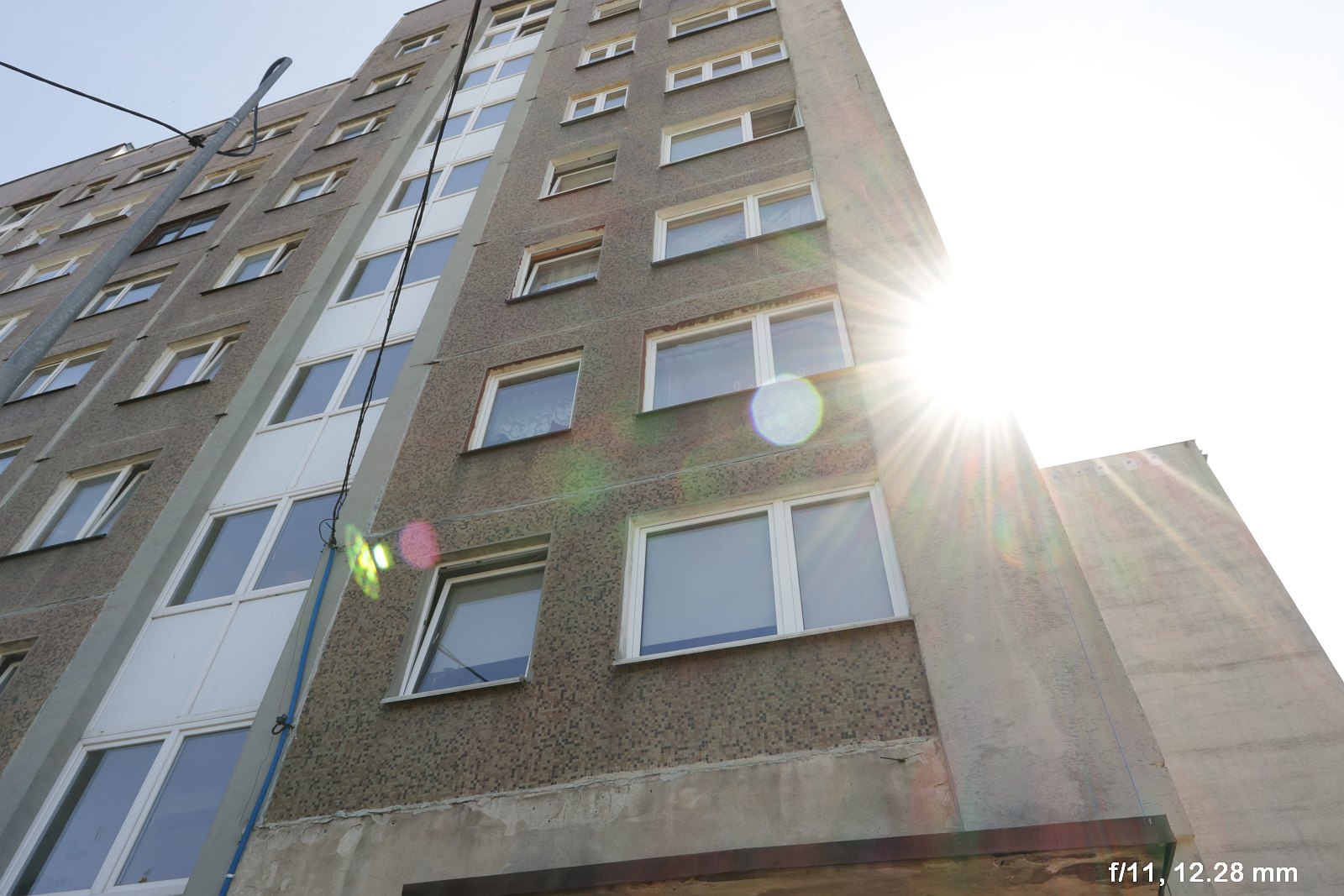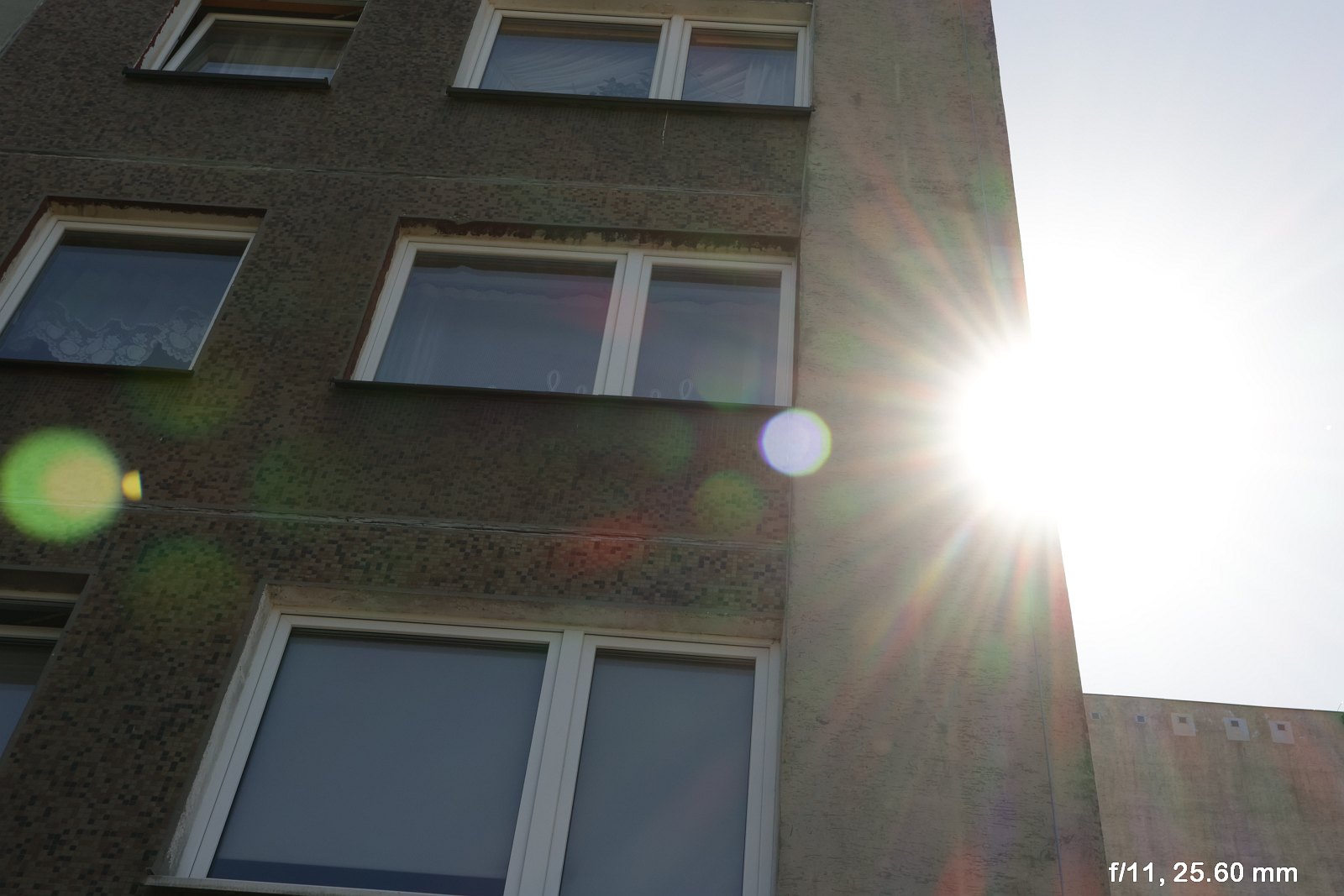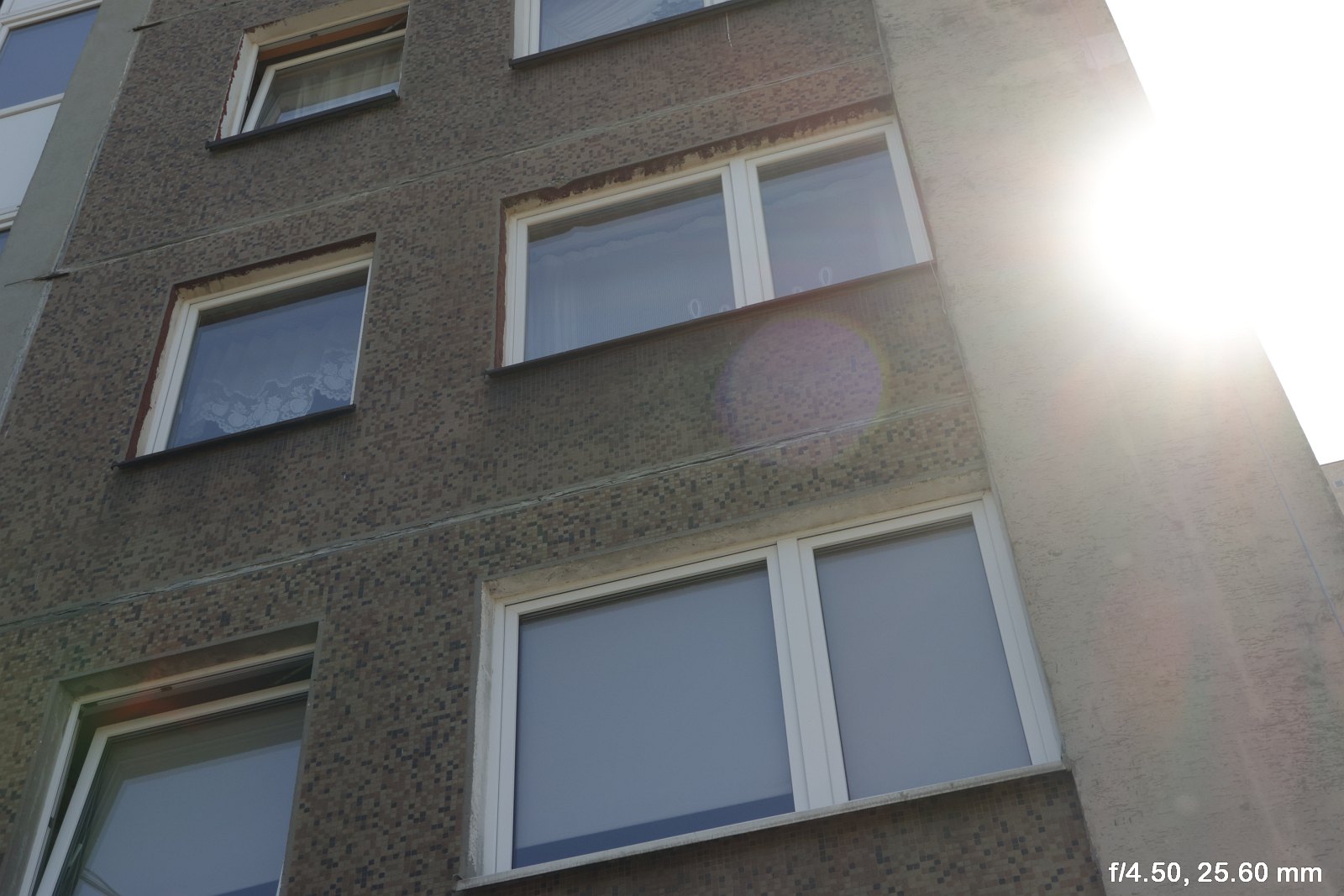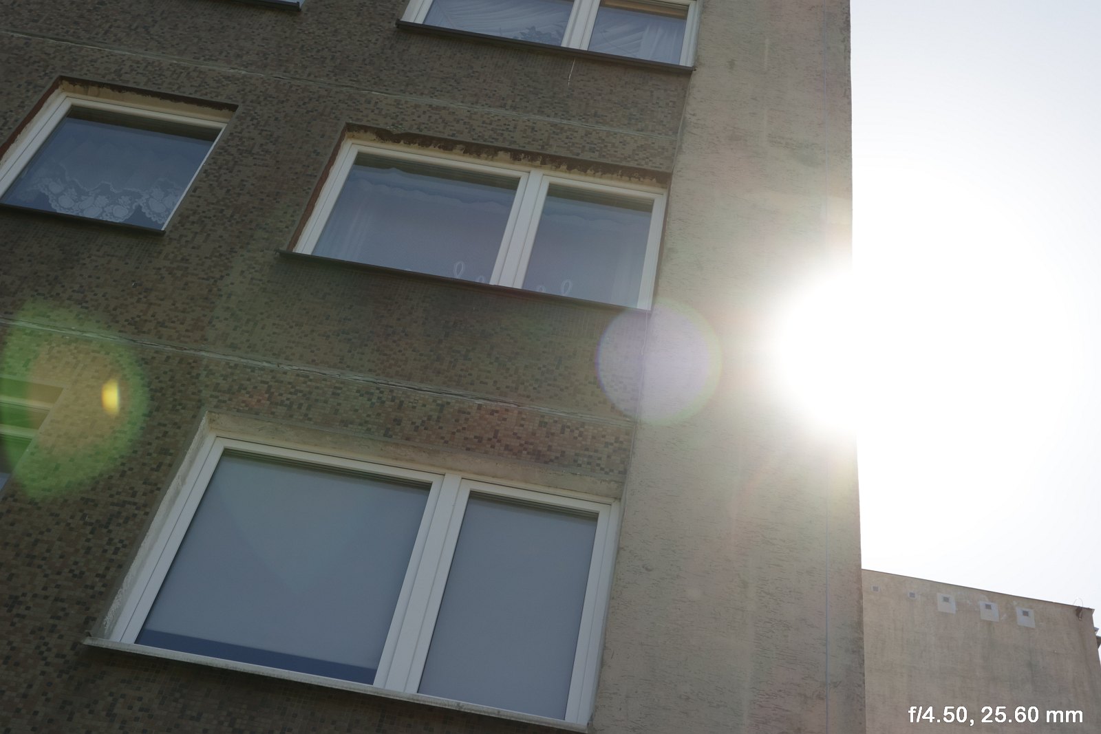 Jako, że w konstrukcji obiektywu mamy 9 elementów w 8 grupach, oznacza to, że mamy 16 granic powietrze-szkło. Odblaski można uzyskać zarówno, gdy słońce znajdzie się w okolicach centrum kadru, jak bliżej jego brzegu. Kolorowe artefakty mają sporą intensywność, nie widać natomiast globalnego spadku kontrastu na całym zdjęciu. Nasza ocena tego aspektu obiektywu w PowerShocie V1 jest generalnie średnia.