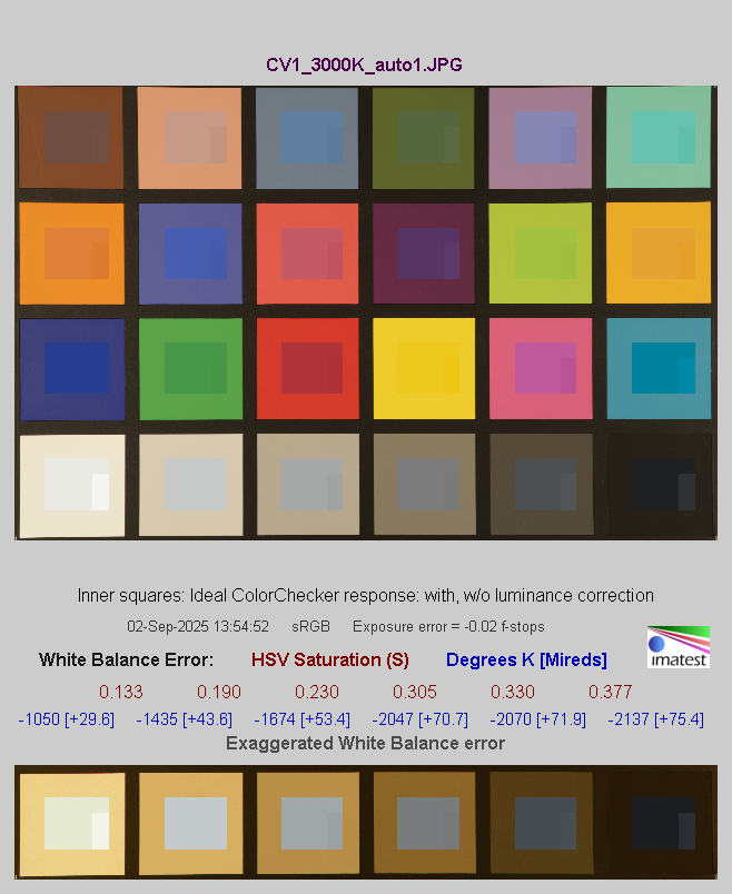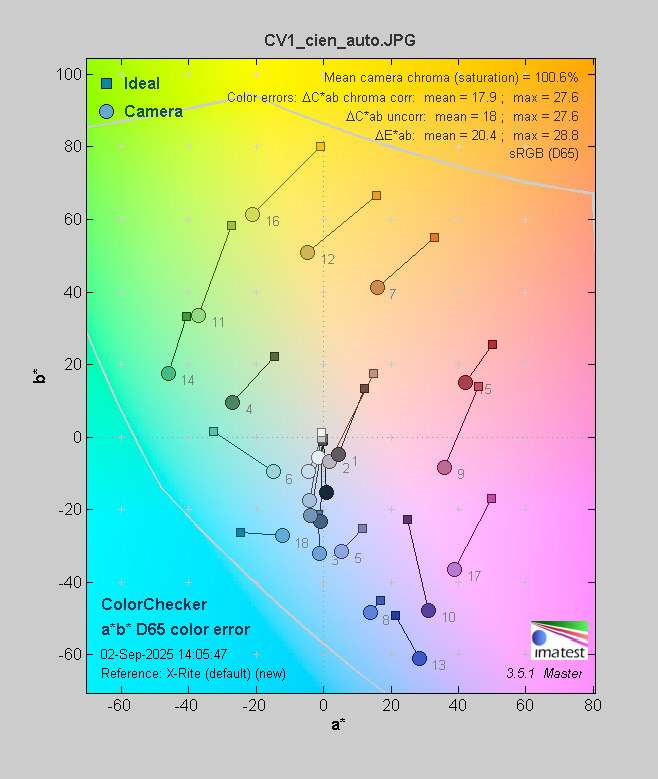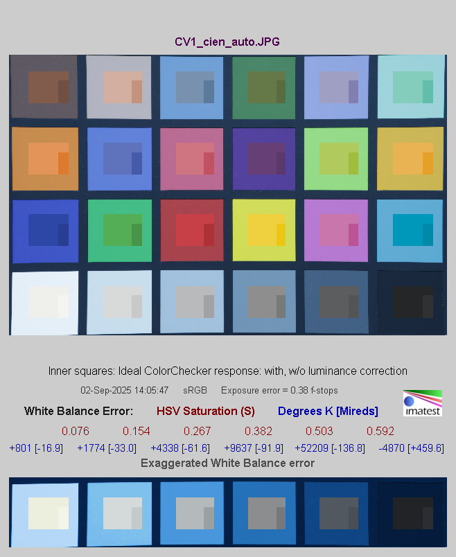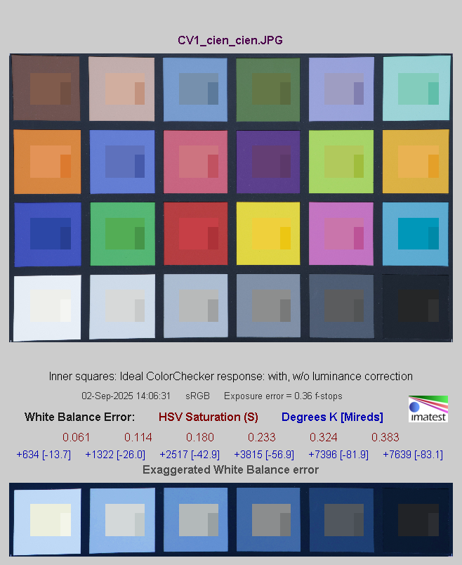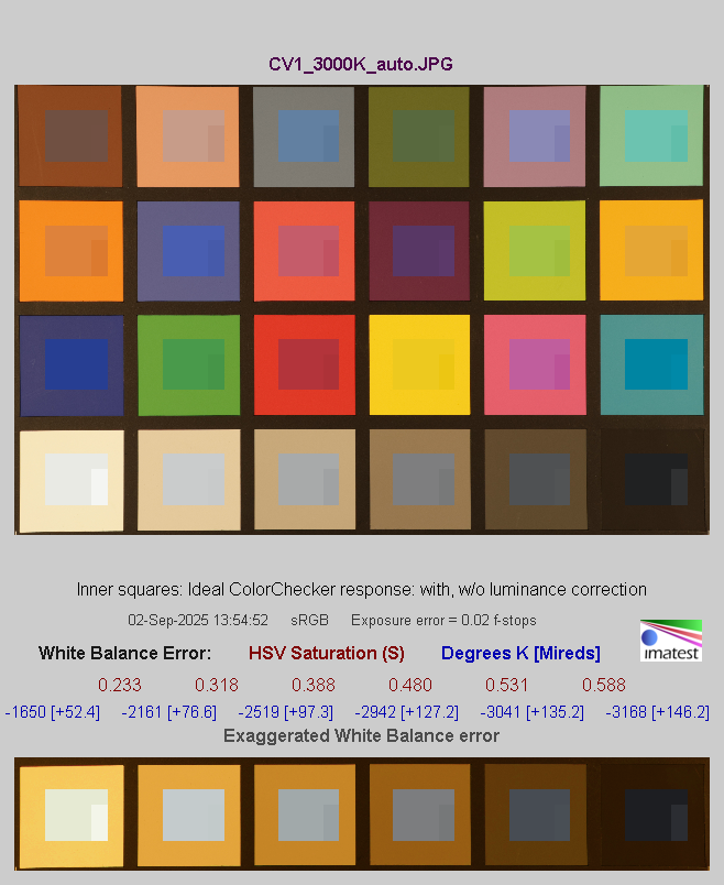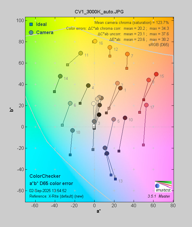 Oprócz automatyki w świetle żarowym, PowerShot V1 świetnie radzi sobie z nasyceniem kolorów. Średnia odchyłka od idealnego nasycenia wyniosła w całym teście zaledwie ok. 3.5%. Brawo!