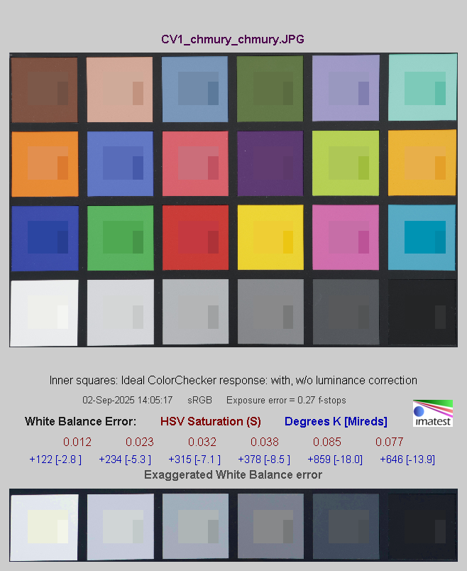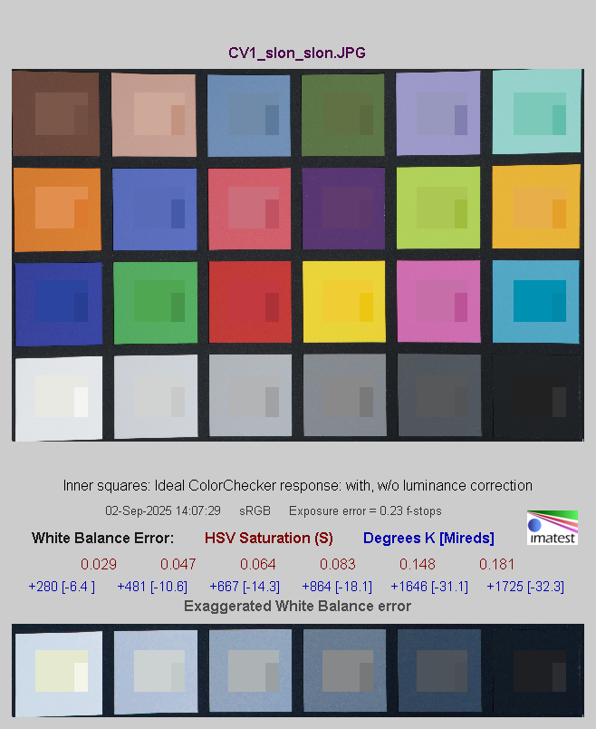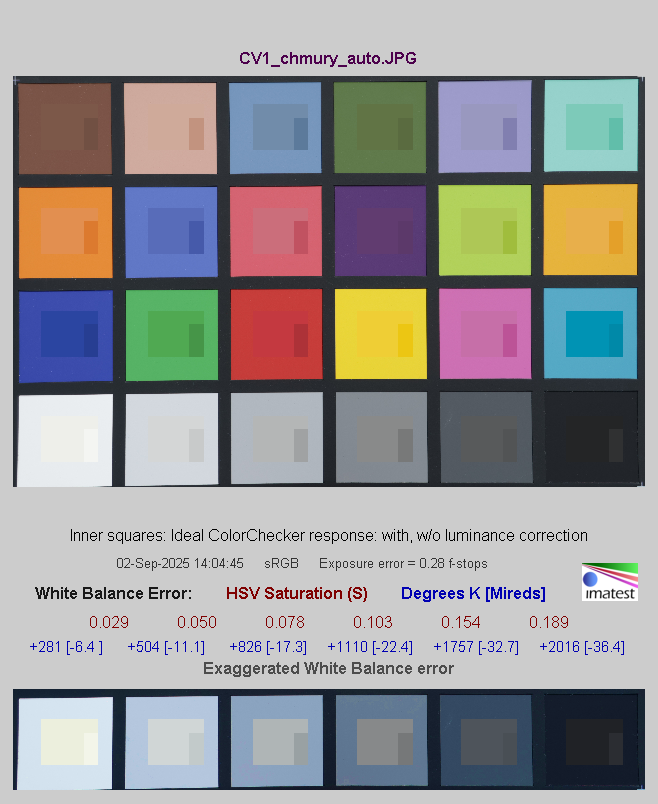 W naszym teście zanotowaliśmy sporo sytuacji, w których błędy dC są nie wyższe od 5, co oznacza bardzo dobre odwzorowanie kolorów. Chodzi tu o pomiar w słoneczny i pochmurny dzień, oświetlenie lampami LED-owymi (5400 K) oraz żarówkami dla odpowiedniego wzorca i wprowadzenia temperatury 3000 K. W świetle żarowym, automatyka dała wysoki błąd, co zaowocowało ciepłym zabarwieniem sceny. Wybór opcji „priorytet bieli” pozwoliło nieco go zmniejszyć. Odwrotna sytuacja wystąpiła w cieniu, tu bowiem automatyka mocno ochłodziła kolorystykę. Odpowiedni wzorzec spisał się lepiej, lecz nie tak dobrze, jak np. w słońcu.