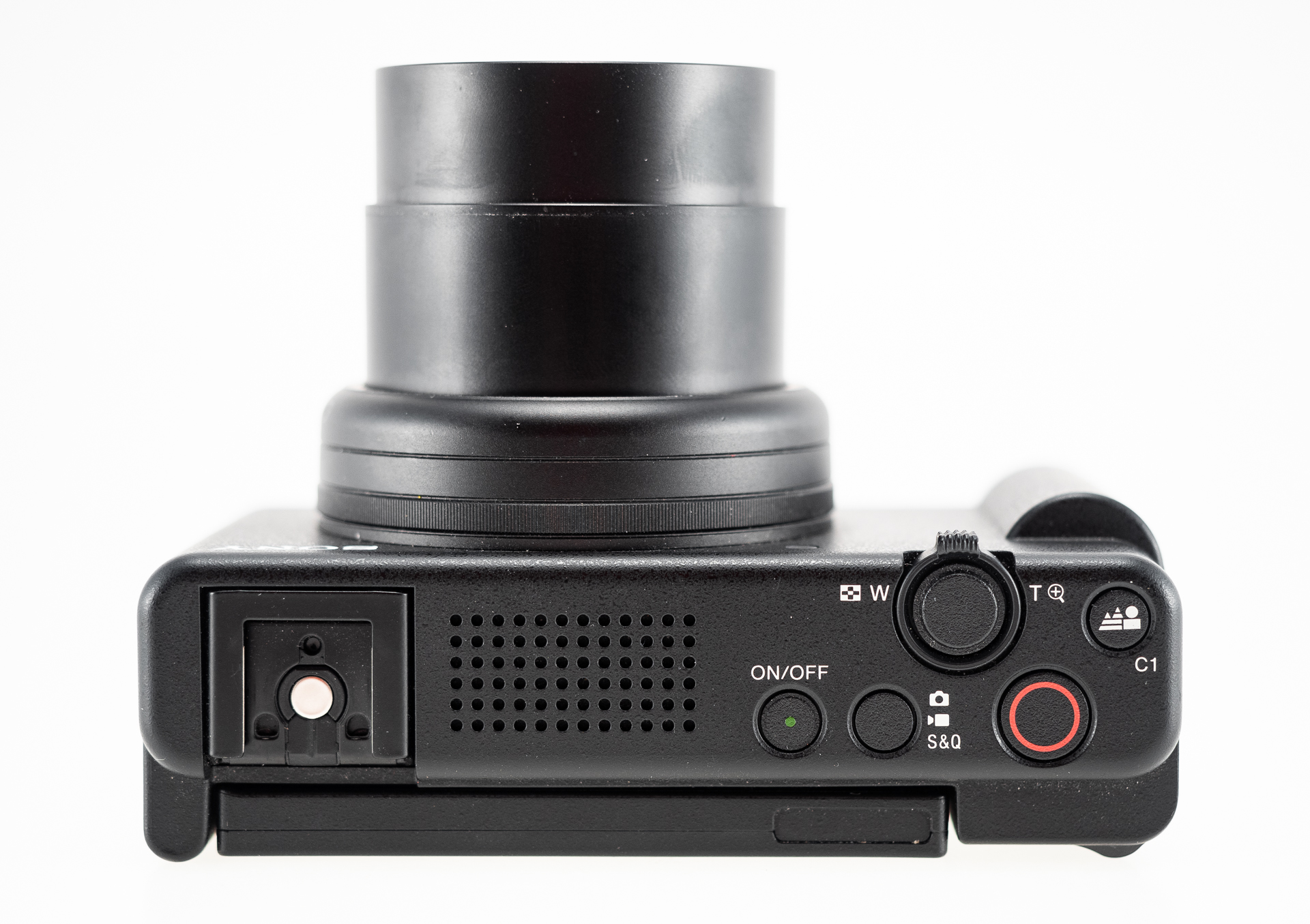 Przednia ścianka aparatu to miejsce zajmowane w znakomitej większości przez obiektyw. O ile w modelach serii RX był on otoczony ruchomym pierścieniem funkcyjnym, w serii ZV-1 niestety z niego zrezygnowano. Po lewej stronie obiektywu znajduje się dioda oświetlająca fotografowany motyw w wypadku niedostatecznej ilości światła zastanego oraz sygnalizująca pracę samowyzwalacza. Spójrzmy teraz na górną ściankę aparatu.