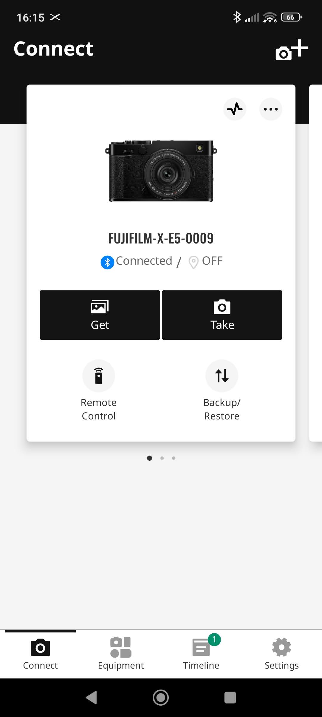 Pierwszym krokiem jest sparowanie aparatu ze smartfonem poprzez Bluetooth, można do tego celu wykorzystać przycisk na spodzie korpusu. Gdy aparat pozostaje włączony, a aplikacja aktywna, komunikacja nawiązuje się automatycznie. Po wybraniu funkcji fotografowania lub przeglądania zdjęć, następuje połączenie przez Wi-Fi, co zabierało zwykle 15-20 sekund.