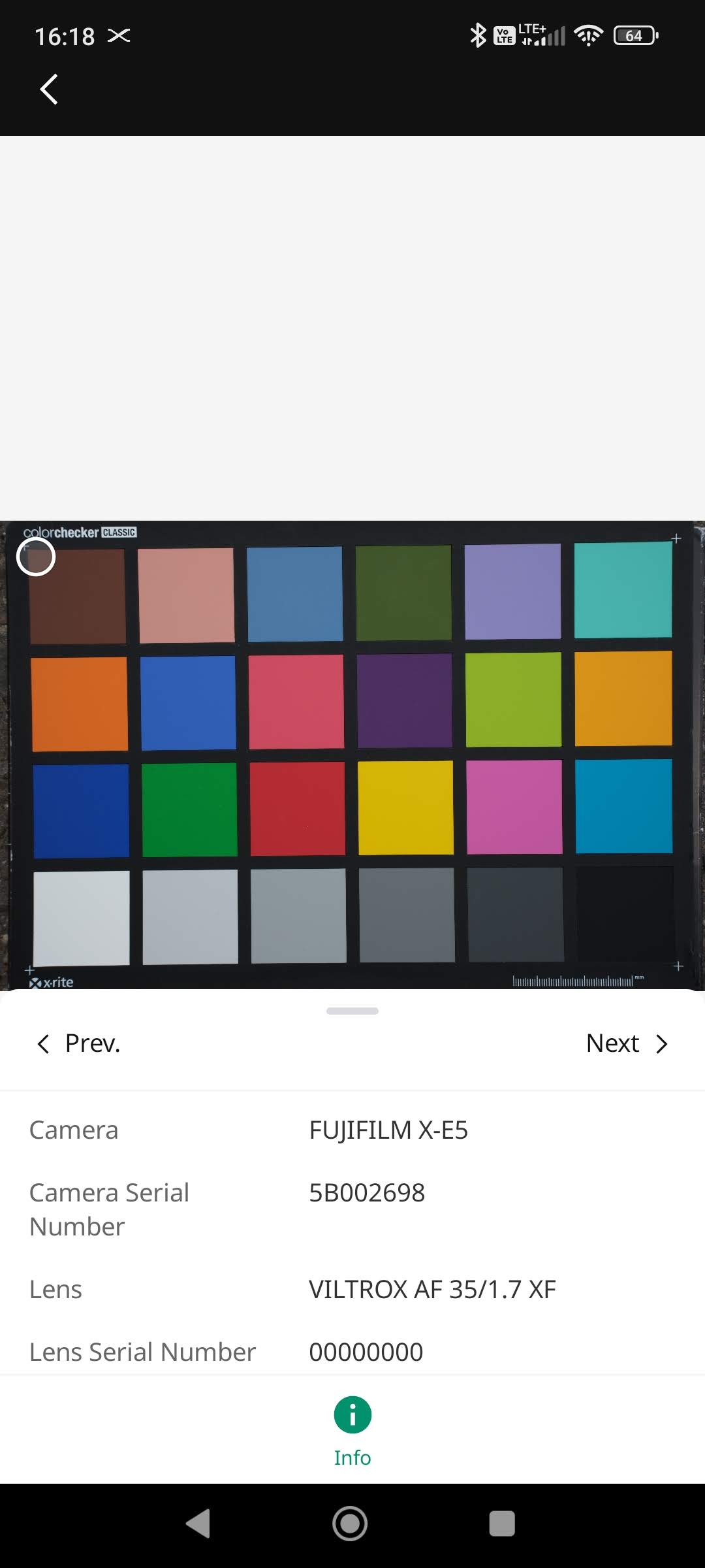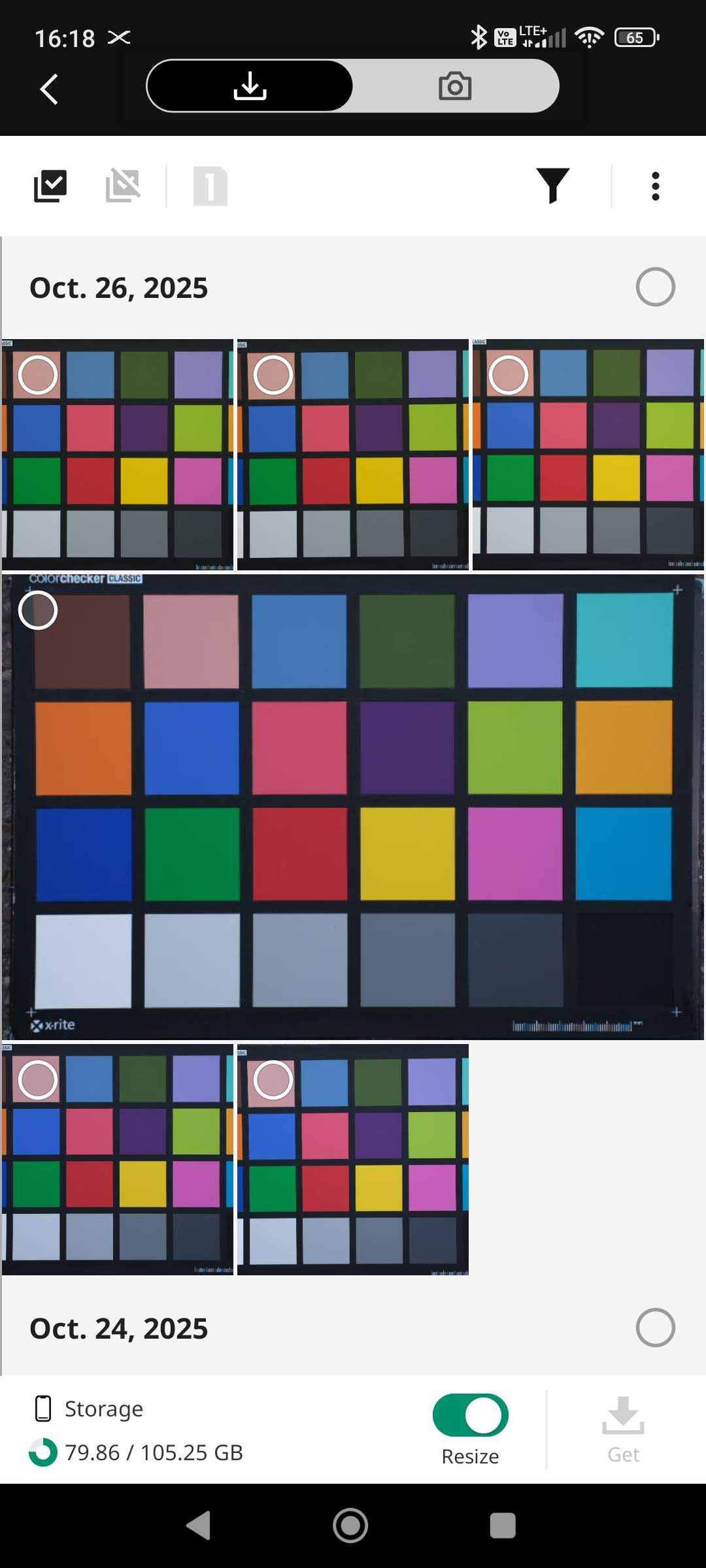 Wykonane zdjęcia (JPEG i RAW) oraz filmy możemy oczywiście kopiować na smartfon, a wybór rozdzielczości tych pierwszych (pełna lub ok. 10 MPix), odbywa się na ekranie, gdzie wybieramy fotografie do przesłania. Transfer jednego zdjęcia (40 Mpix) zabiera ok. 12-15 sekund.