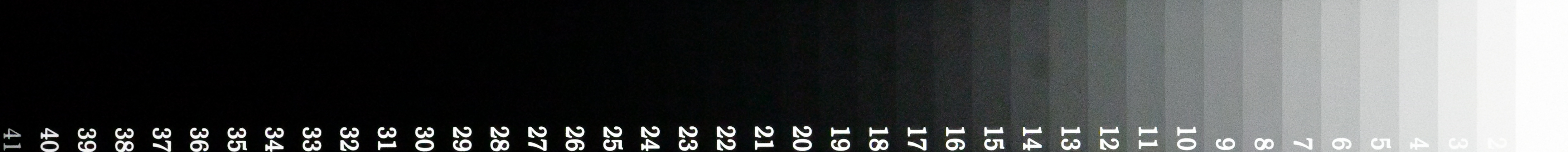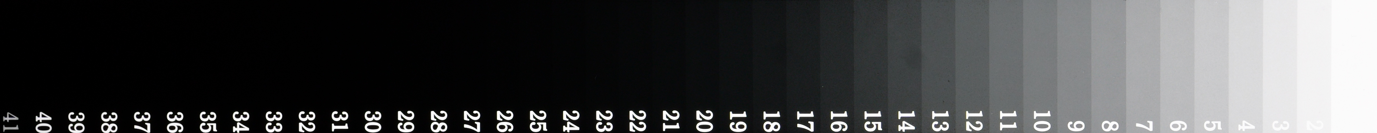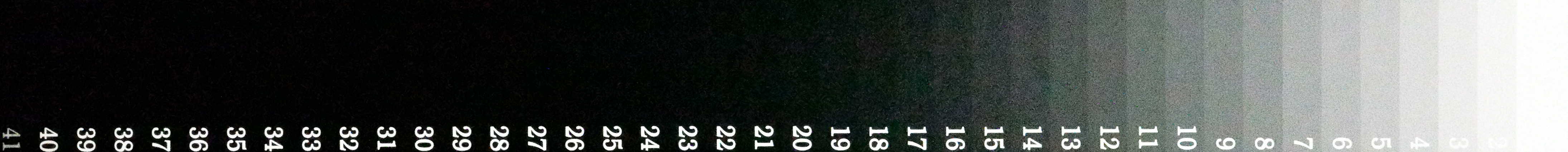 Zakres tonalny na plikach zapisanych w formacie JPEG możemy ocenić wizualnie na wycinkach zdjęć tablicy Stouffer T4110. Kliknięcie na zdjęcie poniżej otworzy wycinek w pełnej rozdzielczości. Odległość pomiędzy sąsiednimi polami szarości wynosi 1/3 EV.