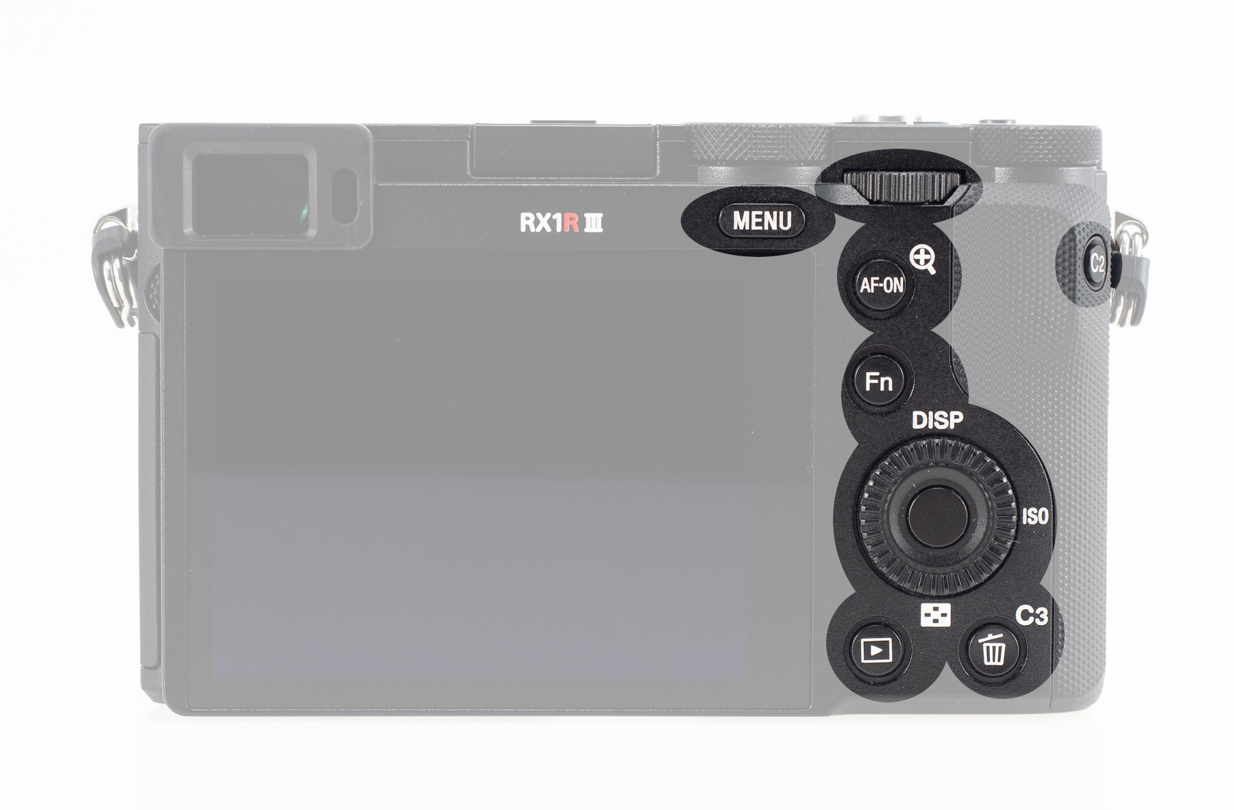 Przy prawym górnym rogu ekranu umieszczono guzik MENU uruchamiający menu główne, a nieco powyżej – górne pokrętło nastawcze. Pod nimi leży przycisk AF-ON, który w trybie odtwarzania odpowiada za przybliżanie zdjęć oraz Fn, uruchamiający podręczne menu i odpowiadający za wysyłanie zdjęć do smartfona w trybie odtwarzania. Poniżej znajdziemy wybierak wielokierunkowy. Prawy przycisk odpowiada za regulację czułości ISO, a górny (DISP) przełącza widok zarówno w trybie fotografowania, jak i odtwarzania. Lewy oraz dolny nie mają predefiniowanych funkcji w trybie live view. Wstępną funkcją przycisku środkowego jest zmiana obszaru AF. Na samym dole znajdziemy tradycyjnie dwa guziki: pierwszy odpowiada za przejście do trybu odtwarzania zdjęć, drugi z kolei, programowalny C3, w trybie odtwarzania służy do usuwania fotografii.