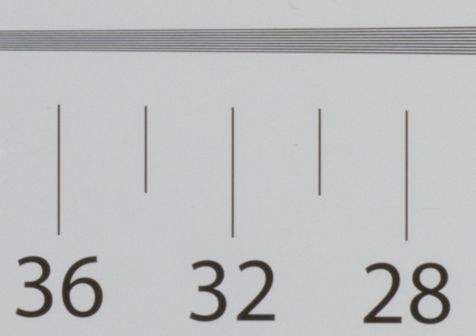 Poniżej prezentujemy nieco pomniejszone wycinki zdjęć tablicy testowej (w formacie JPEG) z okolic centrum kadru dla maksymalnej i minimalnej rozdzielczości. Kliknięcie obrazka otworzy wycinek w skali 1:1.