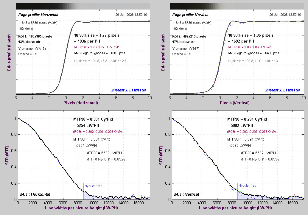 Przebiegi nie wykazują cech wyostrzania, co jest oczywiście dobrą informacją. Wartości odpowiedzi w częstości Nyquista dla obu składowych są jednak nieco za niskie jak na aparat pozbawiony filtra antyaliasingowego. Naszym zdaniem to efekt ograniczonej jakości optycznej obiektywu, który nie pozwala wykorzystać potencjału sensora.