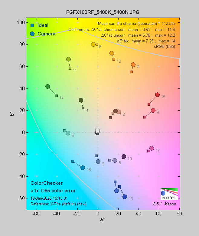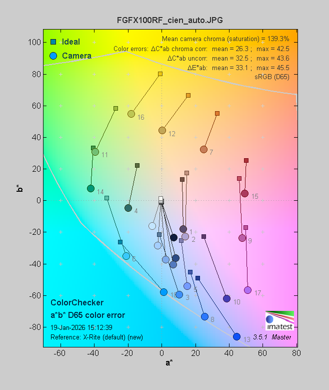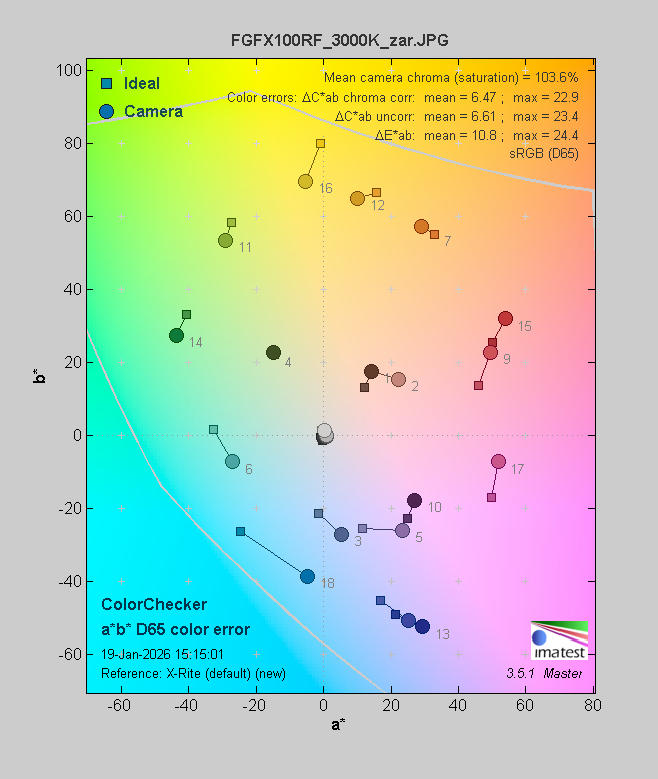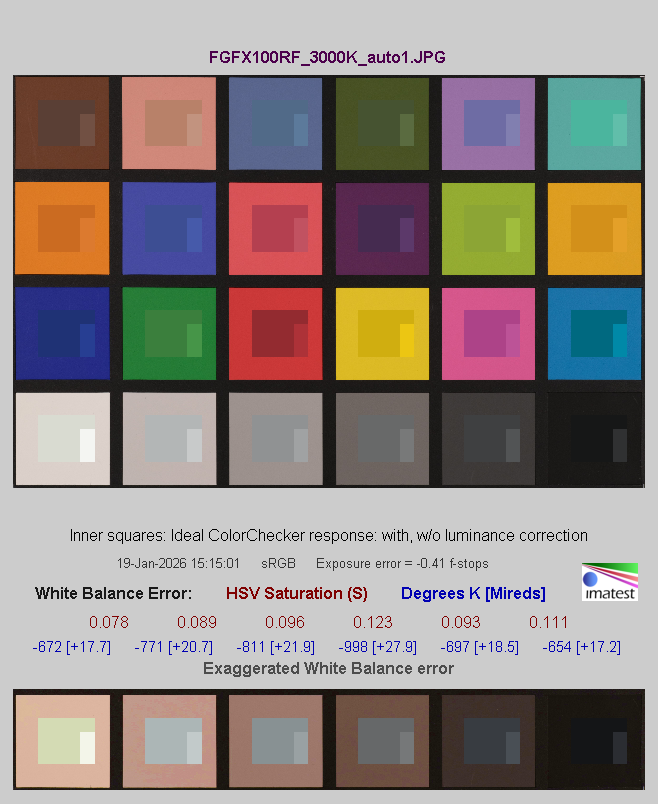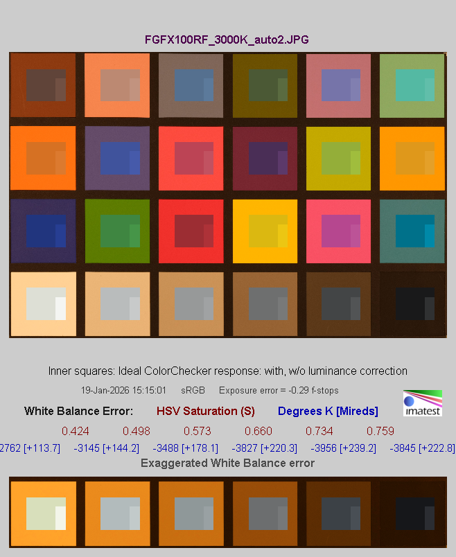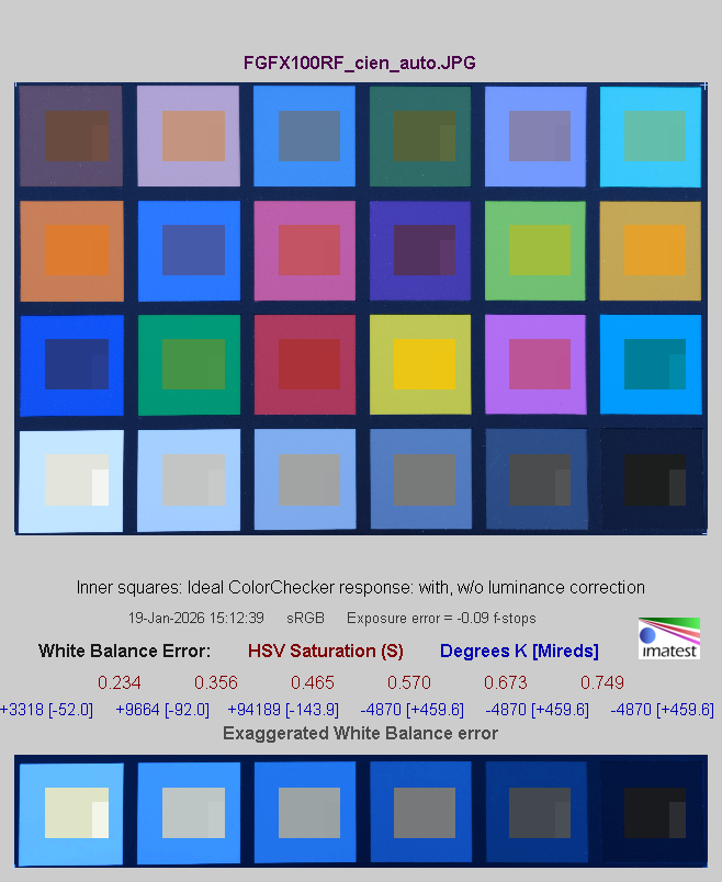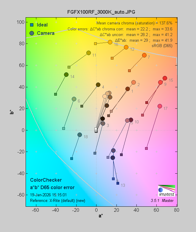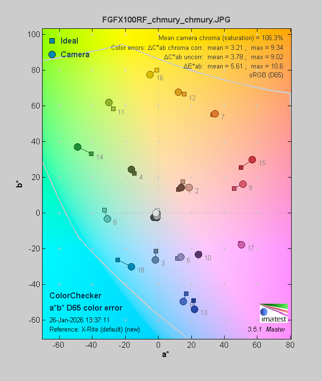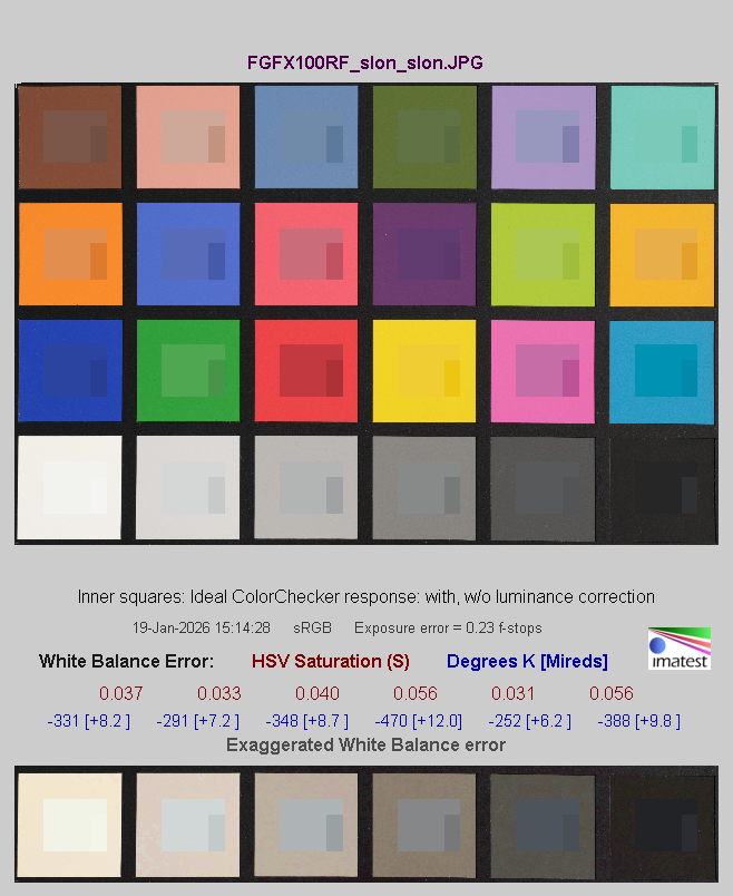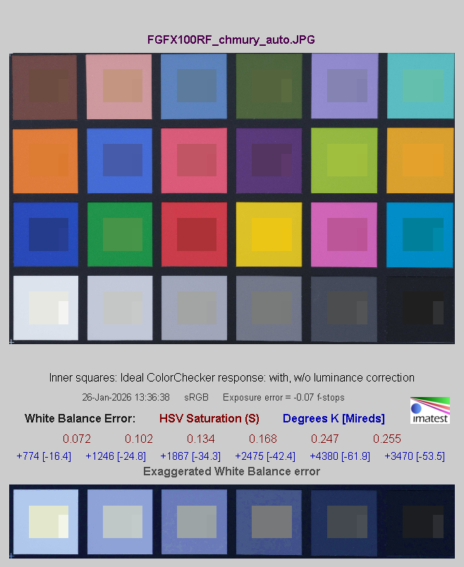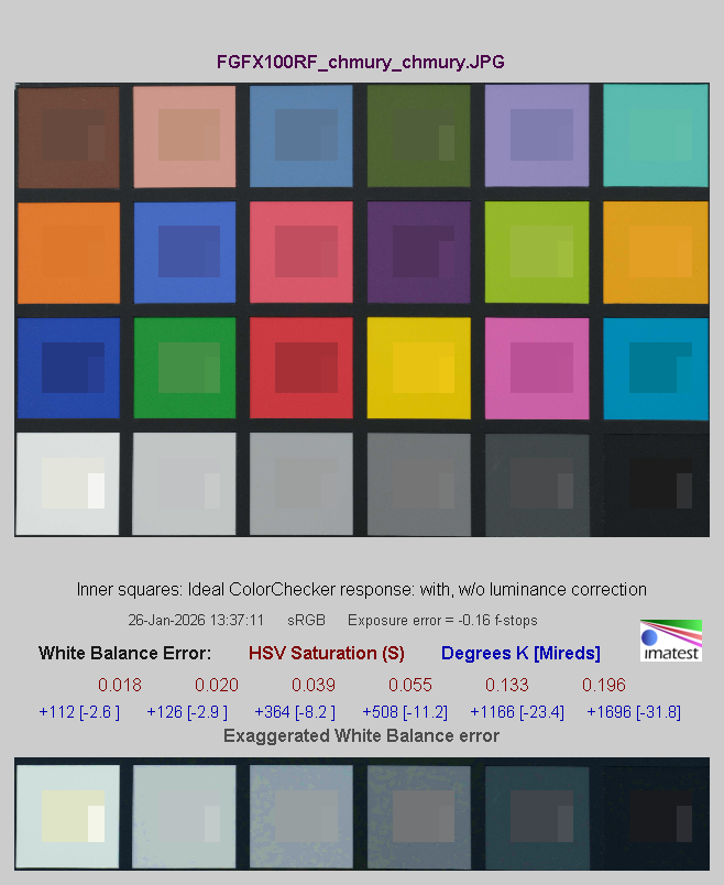 Pomiary skuteczności balansu bieli wykonujemy na 24-polowej tablicy kolorów X-Rite. Następnie wyliczamy parametry dC (średnie odchylenie od właściwej barwy w przestrzeni L*a*b*, czyli wartość błędu, z jakim aparat ocenił barwę) oraz S (nasycenie barwy wyrażone w procentach). Poniżej w tabeli przedstawiamy wyniki dla wszystkich przetestowanych ustawień balansu bieli.