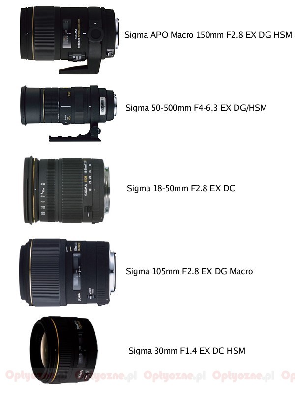Sigma wprowadza na rynek pięć nowych obiektywów przeznaczonych do aparatów z matrycą formatu 4/3, czyli dla lustrzanek firmy Olympus. Są to następujące modele: Sigma 50-500mm F4-6.3 EX DG/HSM, Sigma 30mm F1.4 EX DC HSM, Sigma 18-50mm F2.8 EX DC, Sigma APO Macro 150mm F2.8 EX DG HSM oraz Sigma 105mm F2.8 EX DG Macro.