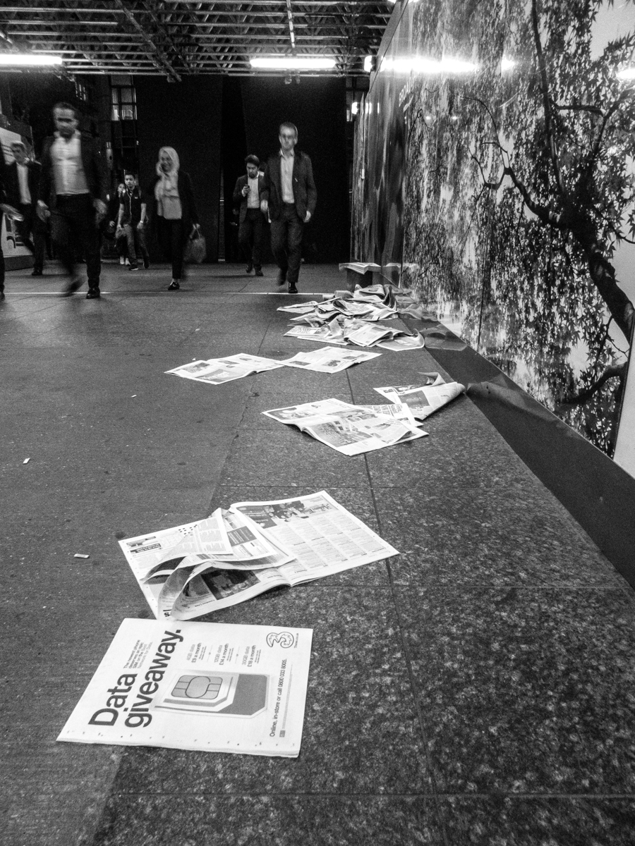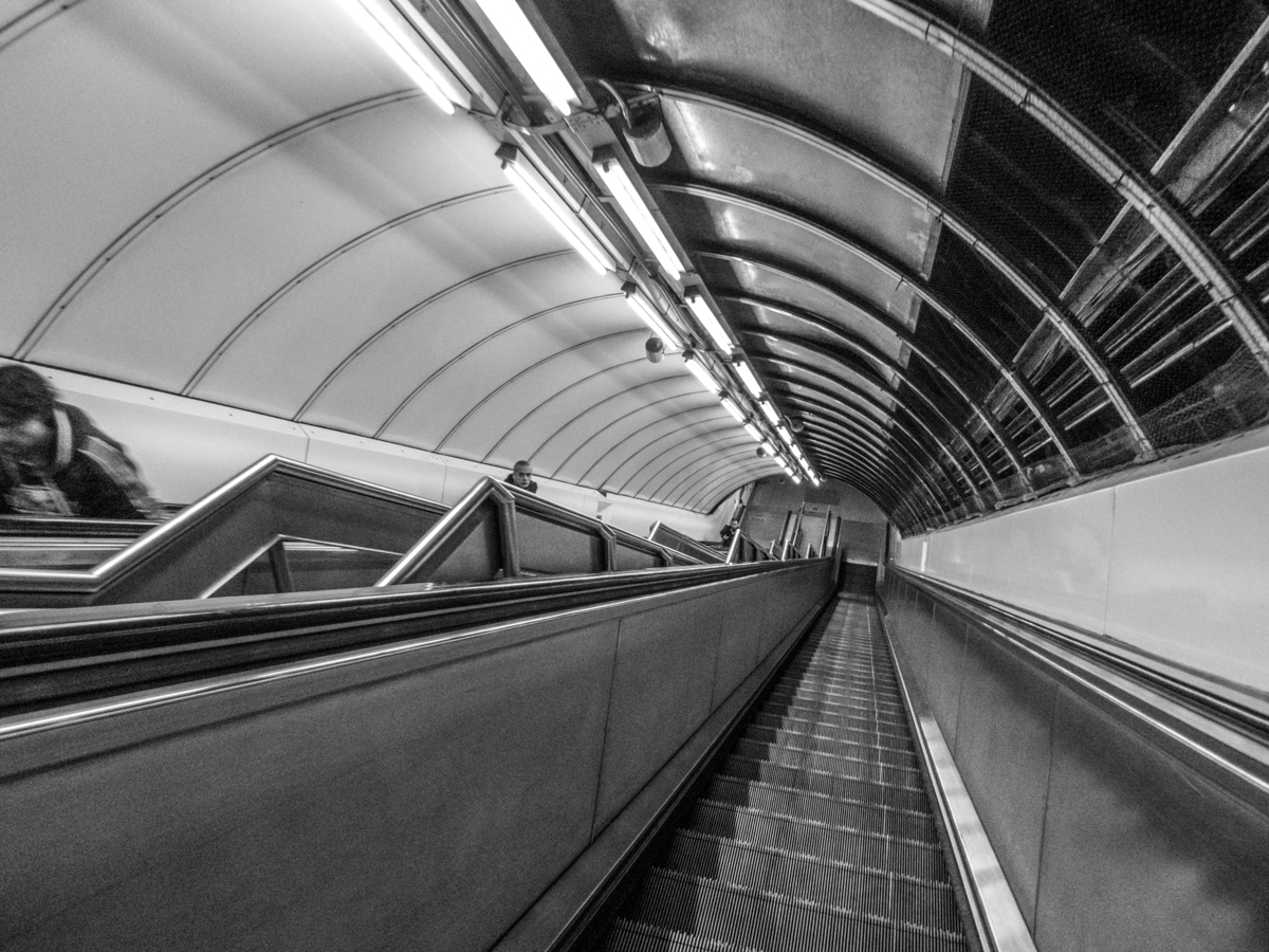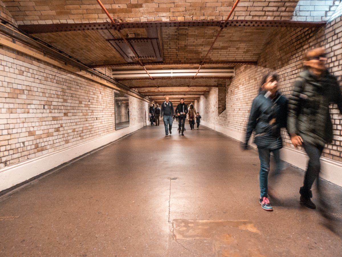 Jak już wcześniej wspominałem, w Londynie spędziłem niecałe dwa dni. Przylot zaplanowałem pierwszego dnia późnym wieczorem, cały kolejny miał być poświęcony zwiedzaniu, a trzeciego dnia po południu wracałem do Polski. Czasu na fotografowanie nie było zatem zbyt dużo, więc kilka pierwszych ujęć wykonałem już po przyjeździe na stację Liverpool Street. Pewne wątpliwości miałem co do tego, jak Lumix TZ90 poradzi sobie w kiepskim oświetleniu, jednak miło się tutaj zaskoczyłem. Zdjęcia były co prawda zaszumione, ale jednak nie na tyle, żeby uznać je za nieużyteczne. Fotografowałem jedynie w RAW-ach, żeby później mieć możliwość wywołania zdjęć "po swojemu", z zastosowaniem odpowiedniego filtra redukującego szumy. Dodatkowo, doceniłem tutaj stabilizację, w którą wyposażony jest TZ90. Poniższe zdjęcia wykonałem przy czasie 1/20 sekundy na najkrótszej ogniskowej. Oba ujęcia zrobiłem z żabiej perspektywy bez dodatkowego podparcia, korzystając z uchylnego ekranu.