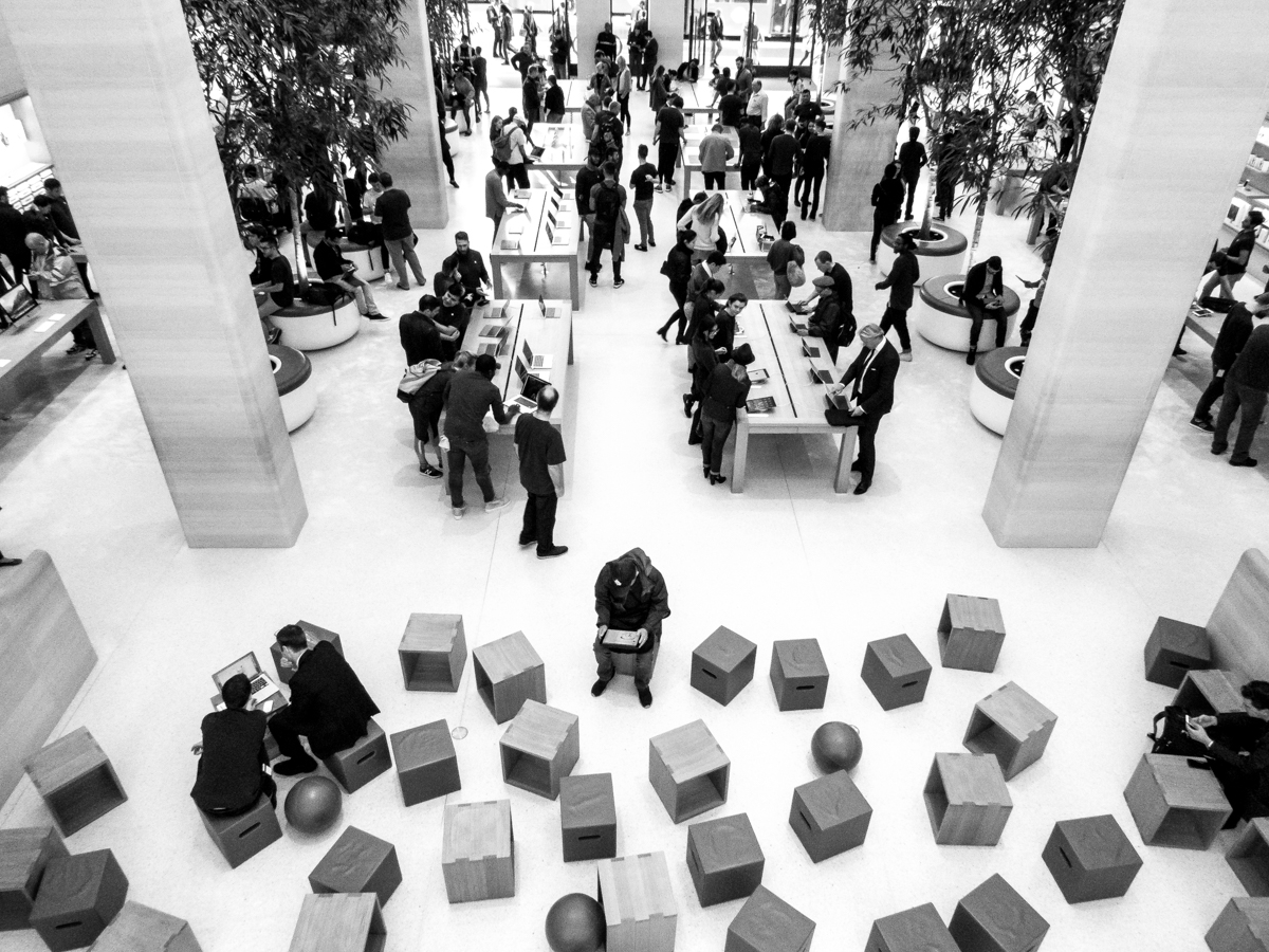 Będąc w okolicy nie mogłem też odmówić sobie przyjemności wejścia do świeżo wyremontowanego Apple Store na Regent Street. Firmowe sklepy Apple są dla mnie pewnego rodzaju fenomenem - odwiedzam je kiedy mogę ze względu na panujący w środku klimat, niekoniecznie z konkretnymi planami zakupowymi. Sklep na Regent Street jest też bardzo ciekawy ze względu na rozplanowanie przestrzeni w środku. Wykonałem jedno zdjęcie przedstawiające sklep od góry - ponownie korzystając z najkrótszej dostępnej ogniskowej. Mimo, że korzystałem z RAW-ów to już w tym momencie wiedziałem, że będę chciał zrobić zdjęcie czarno białe. Kilkukrotnie taka sytuacja powtarzała się podczas mojego wyjazdu, przypisałem zatem wcześniej ustawienie odpowiedniego filtra kreatywnego pod dotykowy przycisk funkcyjny na ekranie. TZ90 posiada ich aż 9 (w tym pięć na ekranie dotykowym), zatem nie ograniczało to w żaden sposób wygody korzystania z aparatu.