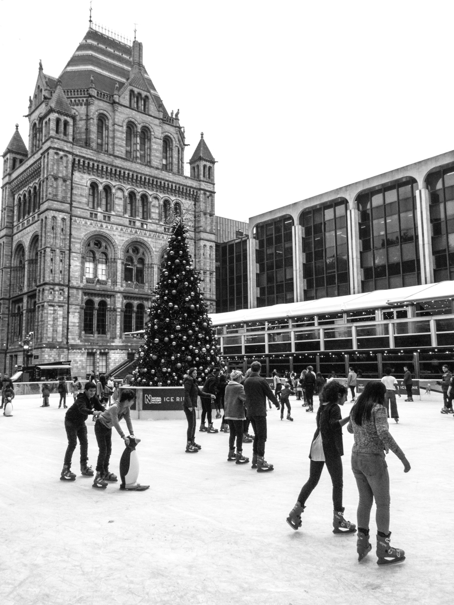 Później udałem się na wspomnianą wyżej wystawę. Wysiadłem na stacji metra South Kensington i jeszcze przed skierowaniem kroków do Muzeum Historii Naturalnej wykonałem parę ujęć w okolicy. Co ciekawe - mimo wczesnej pory (w Londynie byłem pod koniec października) przed budynkiem muzeum rozstawione już było lodowisko i choinka. Podczas fotografii szybki poruszających się na nim ludzi idealnie sprawdził się szybki tryb seryjny TZ90. Dzięki serii 10 kl/s mogłem wykonać kilkanaście ujęć, z których potem wybrałem jedno najlepiej skomponowane.