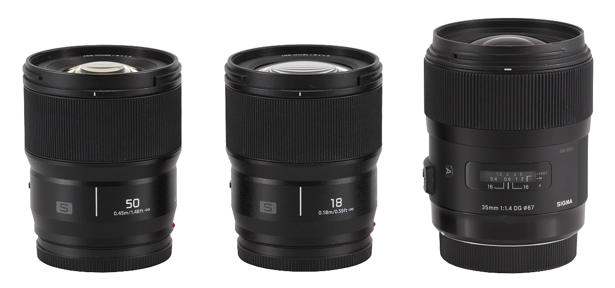 Na poniższym zdjęciu Panasonic Lumix S 18 mm f/1.8 stoi pomiędzy swoim systemowym bratem o parametrach 1.8/50 oraz lustrzankową Sigmą A 35 mm f/1.4 DG HSM.