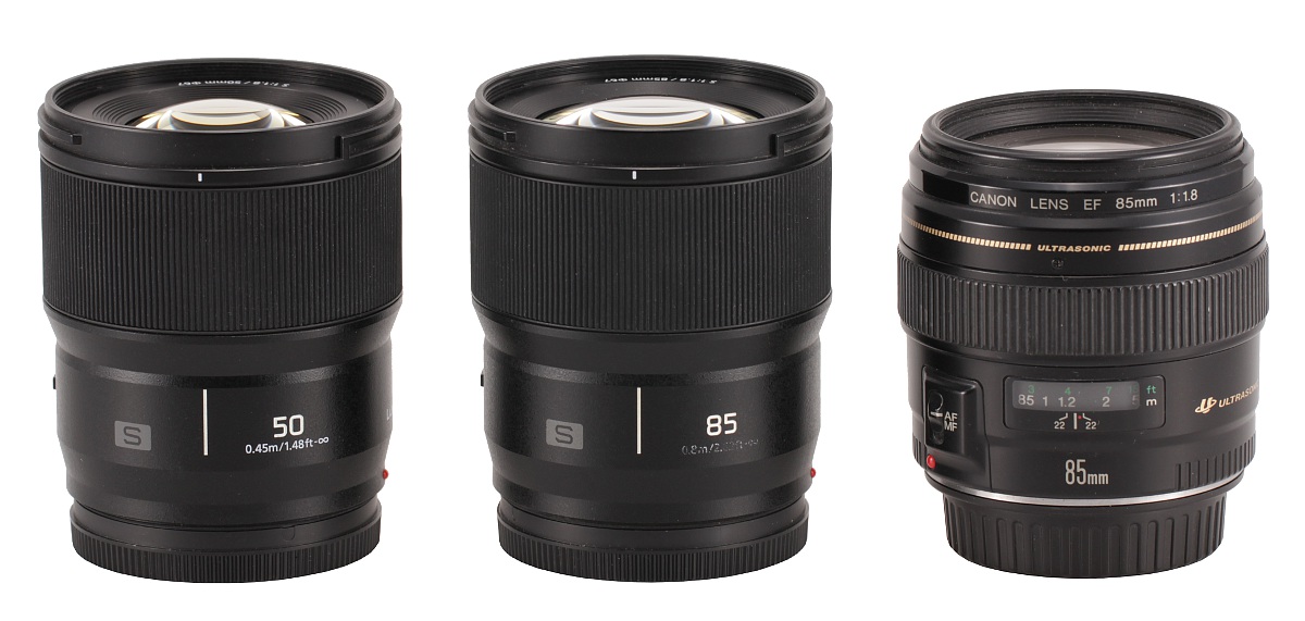 Na poniższym zdjęciu Panasonic S 85 mm f/1.8 stoi pomiędzy swoim systemowym kuzynem, czyli modelem Panasonic S 50 mm f/1.8 oraz lustrzankowym Canonem EF 85 mm f/1.8 USM.
