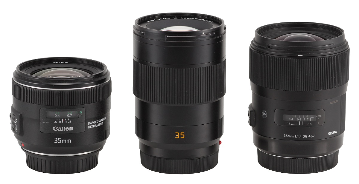 Na poniższym zdjęciu Leica APO-Summicron-SL 35 mm f/2 ASPH stoi pomiędzy dwoma lustrzankowymi 35-tkami. Po lewej ma Canona EF 35 mm f/2 USM, a po prawej Sigmę A 35 mm f/1.4 DG HSM. Jak widać, Leica jest dłuższa nawet od wyraźnie jaśniejszej Sigmy.